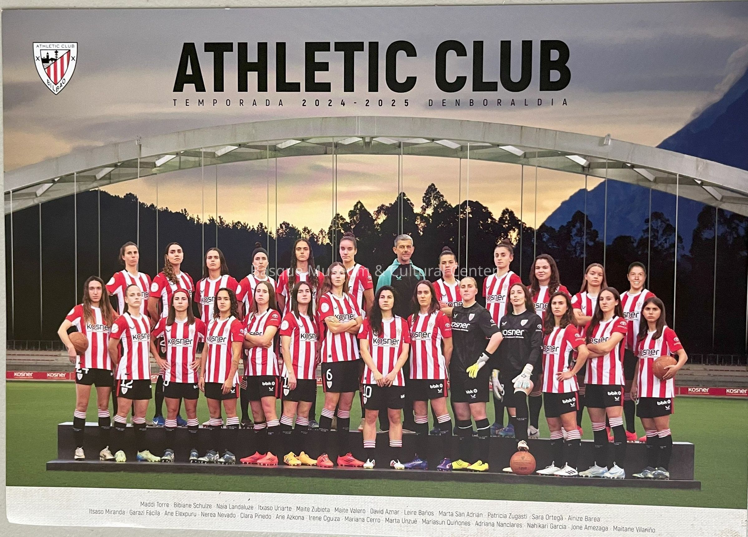 Full-color poster of the 2024-2025 season coach and female members of Athletic Club Bilbao. Includes the Athletic Club Bilbao logo in the upper left corner and names of those pictured.