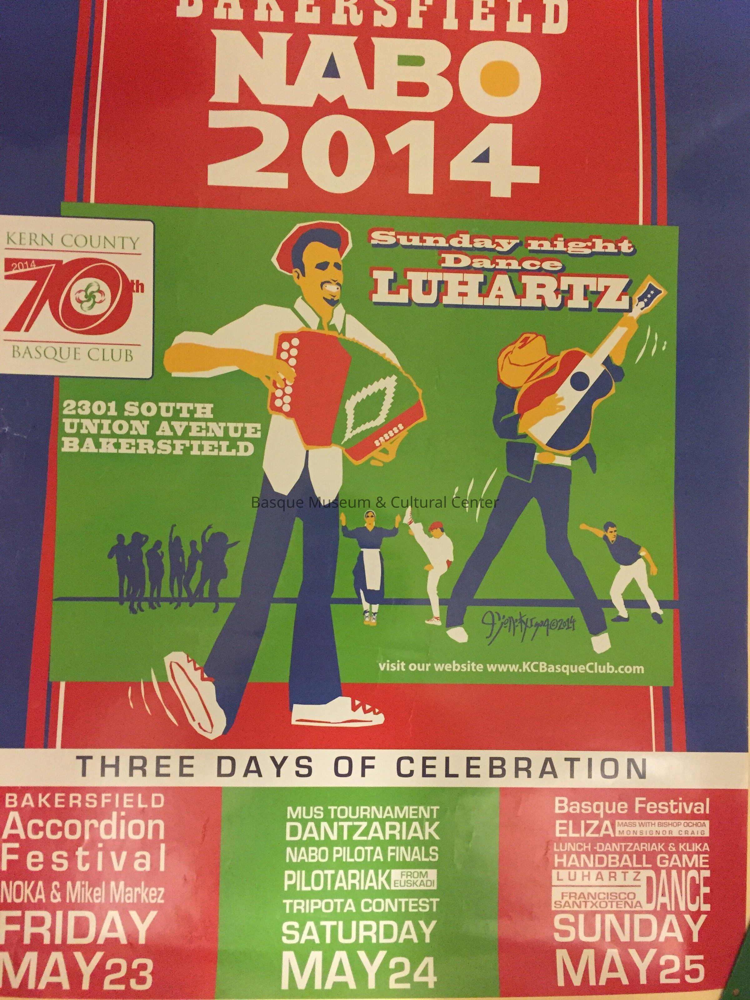 Color poster promoting the 2014 NABO festival in Bakersfield, California. Colors are red, blue, green and white; drawings of dancers and musicians in the center with location, dates, and sponsors along the edges.