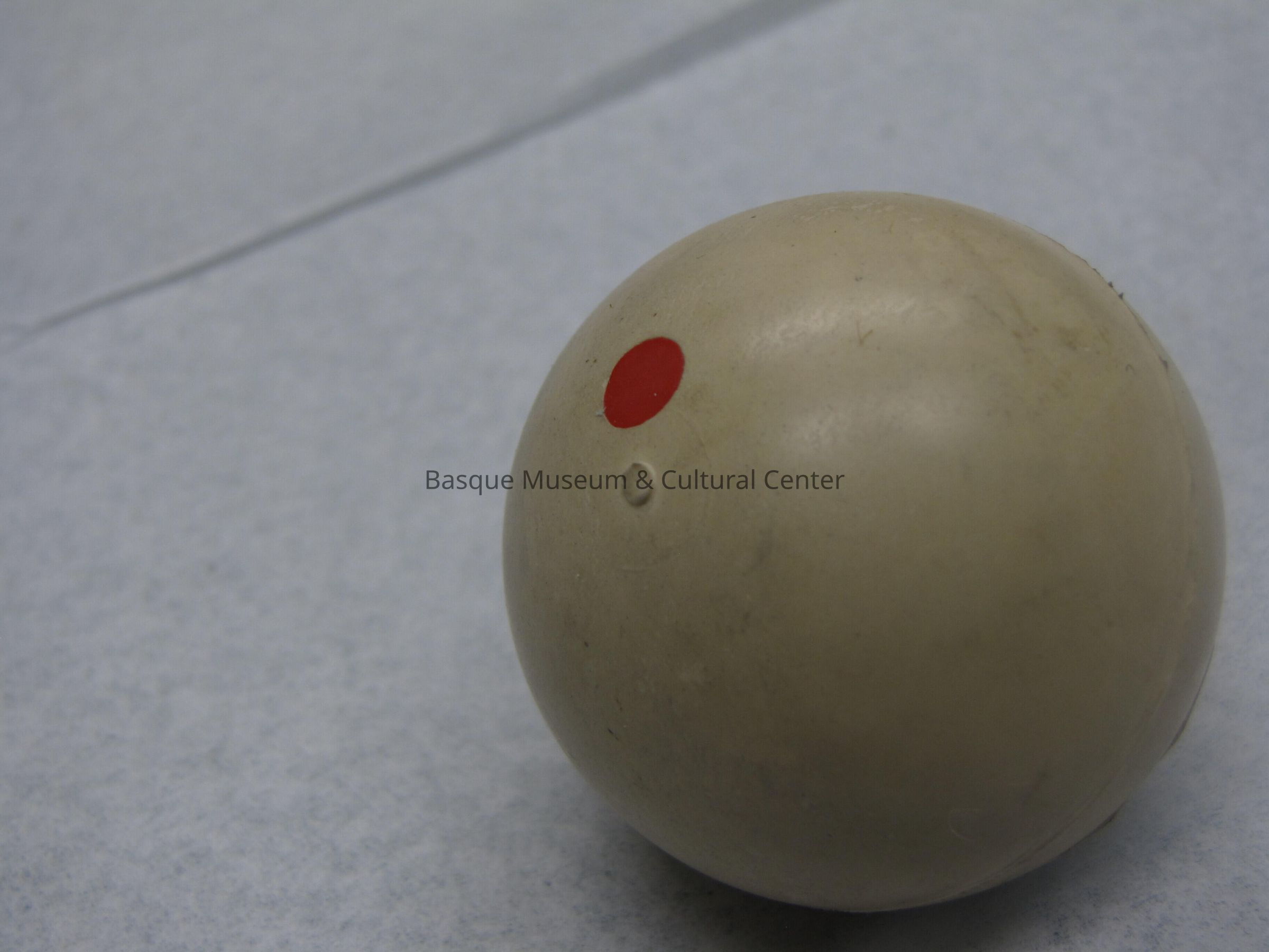 Small off-white Pelota pala ball. There is a line round the middle and a small notch right by a red dot of paint. A rectangular white label says 1 Pelota Pala Goma (Blanca). There is one large divet out of the side right by the label, the ball looks used and has dark markings.
