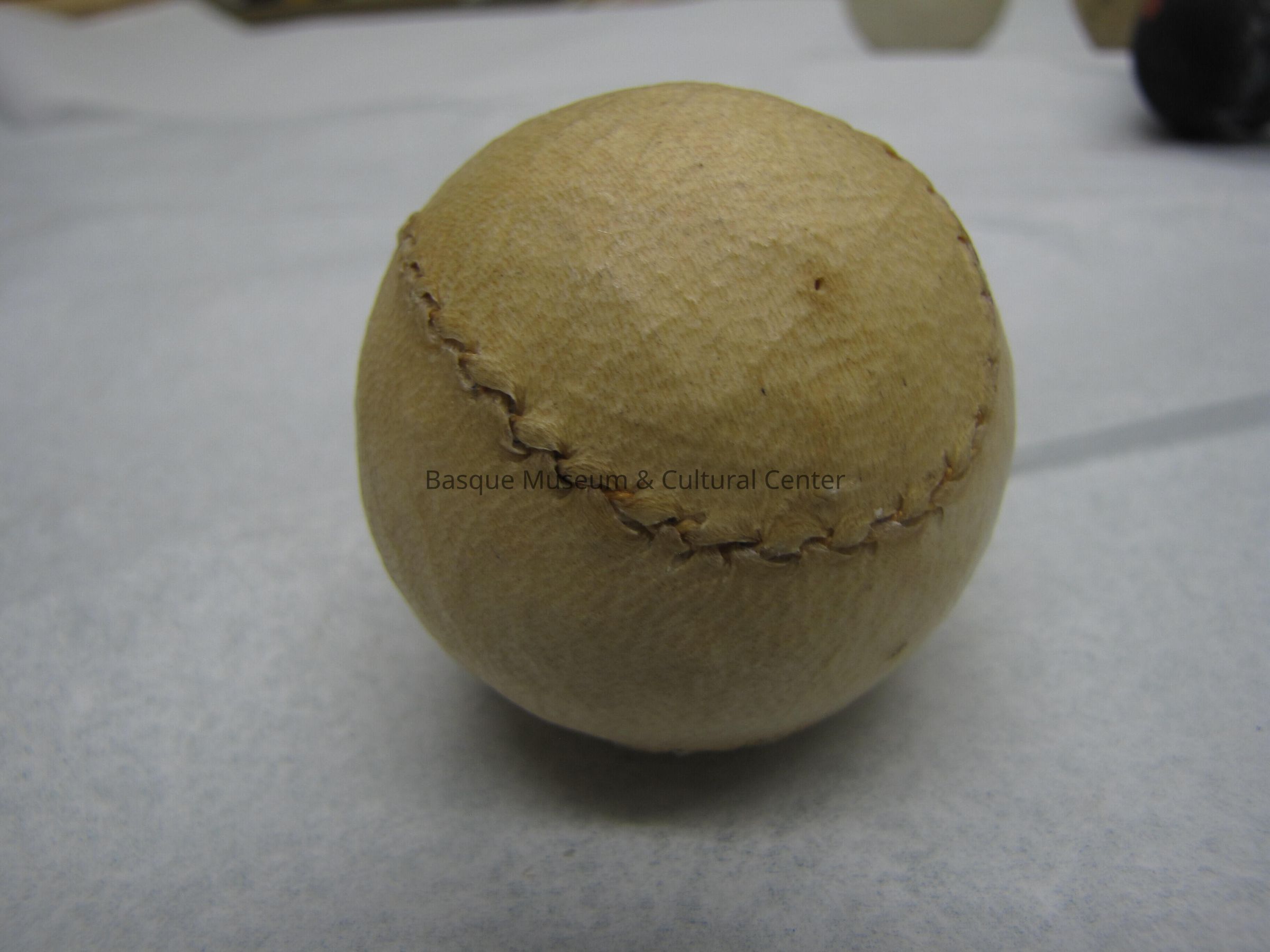Small off-white Jai lai ball, stitching is in the same pattern as a baseball. Dents and lines all over from use; Small in size