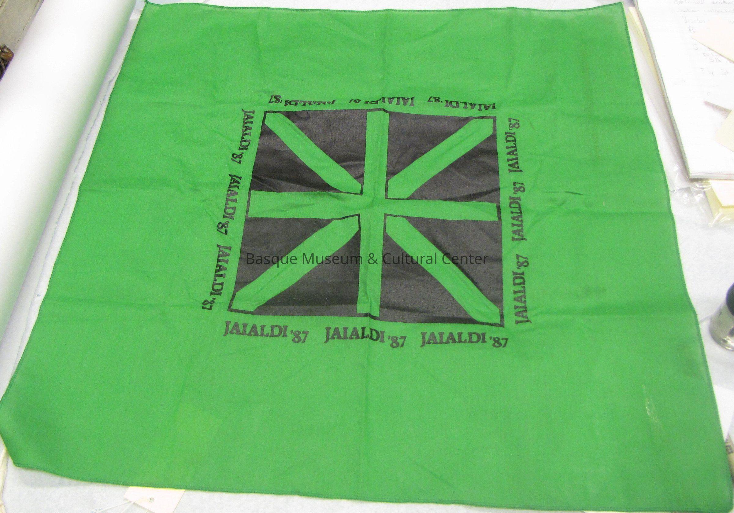 Dark green bandana from the 1987 Jaialdi. Large Basque flag printed in the very center with Jaialdi '87 written around all the edges both in black print. There is nothing on the other side, but you can see the front pattern through. Material is partially see through and very thin, the corners have small strings coming out of their seam.