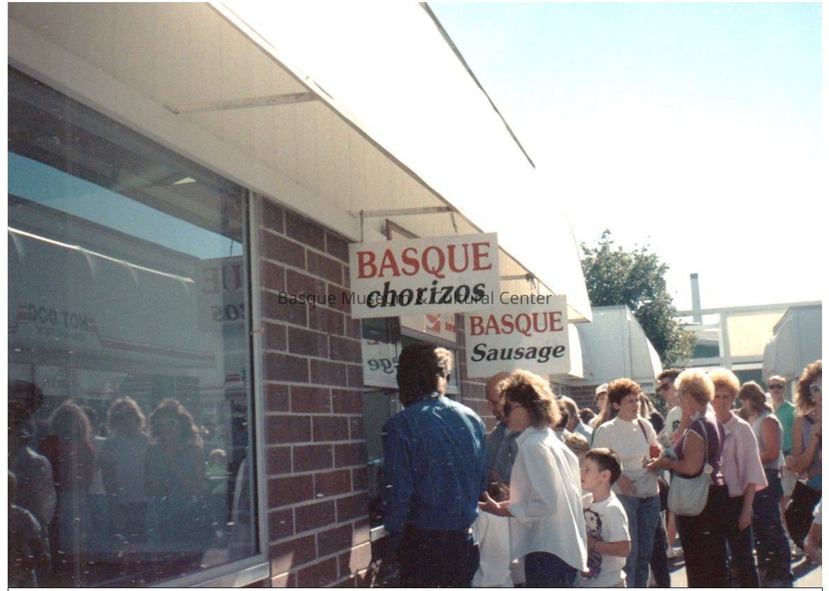Digital scan of a color photoprint: line of unidentified people at the Basque Club of Utah booth at the Salt Lake City County Fair. Signs for Basque chorizos and Basque sausage hang from the booth.