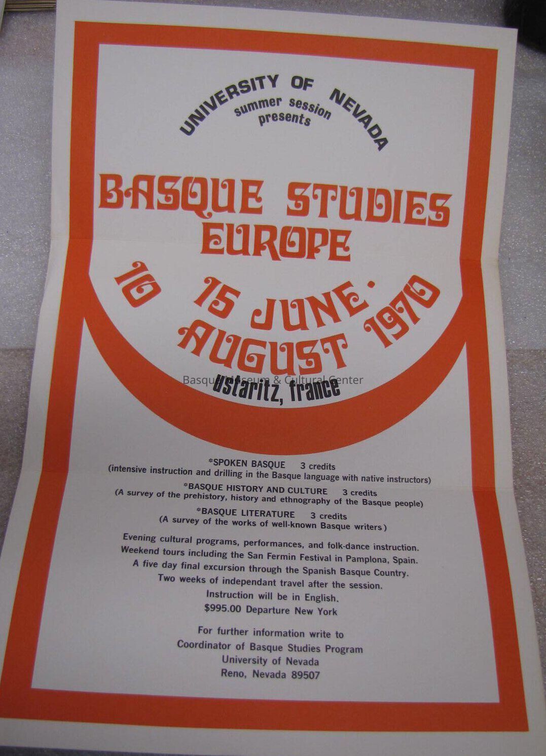 Poster advertising the Univeristy of Nevada's Basque Studies Trip to Europe from 15th of June to the 10th of August in 1970. The poster is white and red. The border is white and then there is a red border; Within the red border it states "University of Nevada; Summer Session Presents; Basque Studies Europe; 15 June- 10 August 1970; Ustaritz, France" Then there is a large red loop. Under that it discusses the different classes and their credit amount. It also states different opportunities to experience. At the very bottom it has the price, and if you have further questions or want more information contact the coordinator. The poster has been folded two times horizontally; on one of the panels, on the back, it states "Univeristy of Nevada Summer Session Reno, Nevada 89507" 11" x 16 15/16"