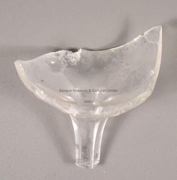 Part of a wine glass found under the dining room of 607 Grove Street in Boise, Idaho. The section of the glass found is the bottom of the cup portion of the glass and the top of the stem. The stem has six flat sides that terminate in a wide rounded design on the underside of the cup. The glass is clear and smooth. The surface of the glass has iridescent flakes from minerals being leeched out of the glass by the surrounding soil.