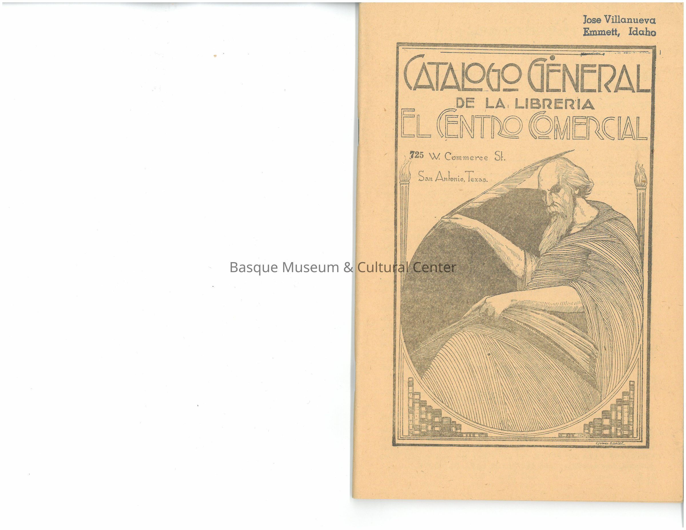 Booklet - Catalogo general de la libreria el centro comercial, located at 725 W. Commerce St. , San Antonio, Texas. Cover is stamped: Jose Villanueva , Emmett, Idaho