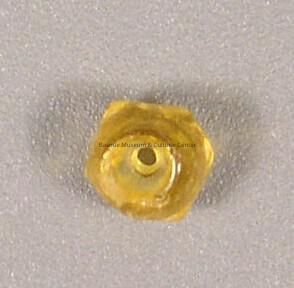 Pressed faceted amber-colored glass bead found in the parlor of 607 Grove Street during an archaeological excavation. There are six sides on the top and bottom half of the bead. The facets and general shape of the bead are very irregular. It appears that some of the facets were pressed and others were ground. Some of the facets have striations, others do not. A single hole passes through the bead. One end of the opening is larger than the other (hole is conical). The opening to the wide end has rounded edges. The opening to the small end is indented into the bead.
