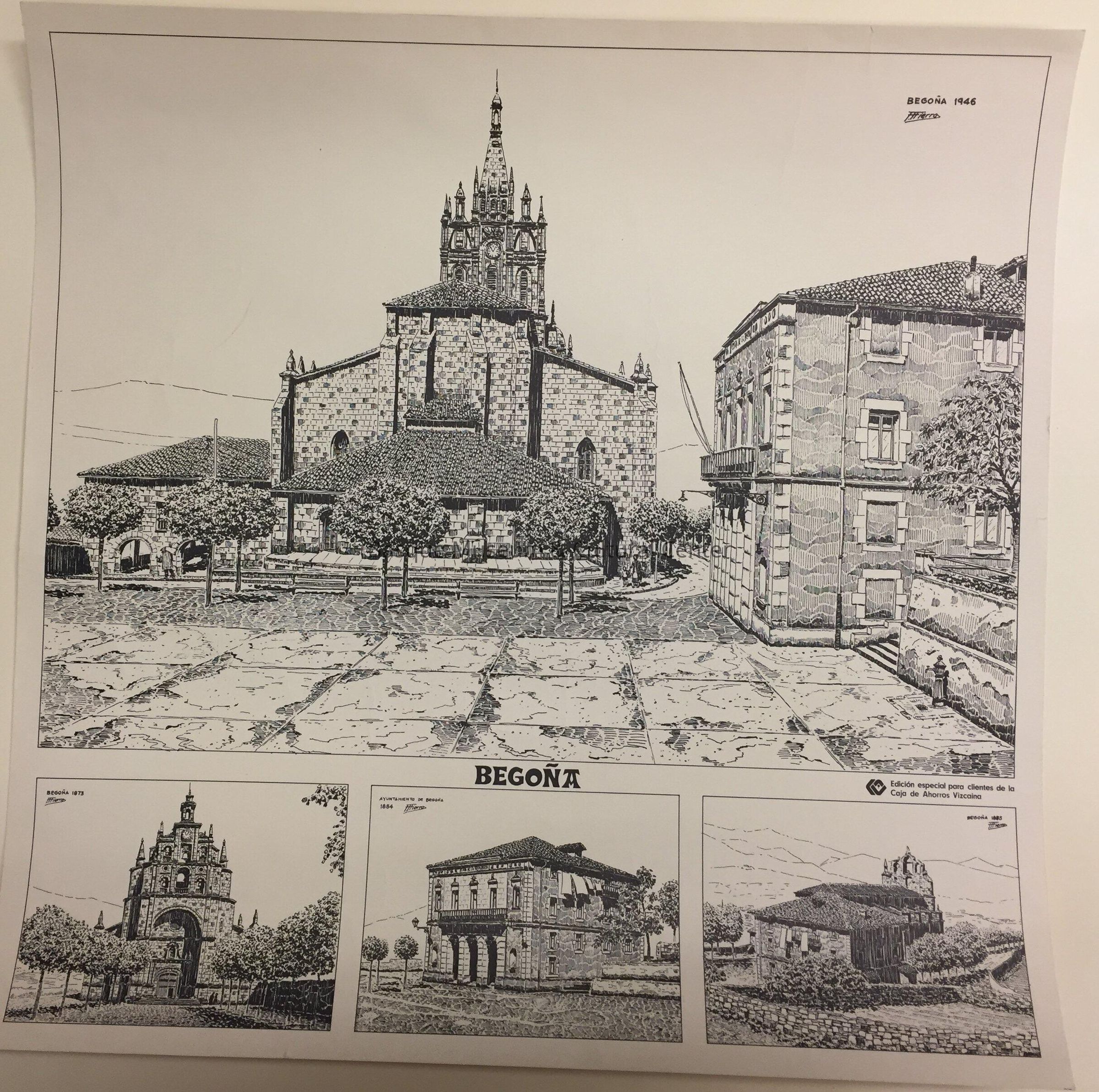 Black and white poster of 4 line drawings of the town of Begona in Bizkaia province, each showing a different building and at different dates - 1873, 1884, 1885 and 1946. Artist is F. Fierro.