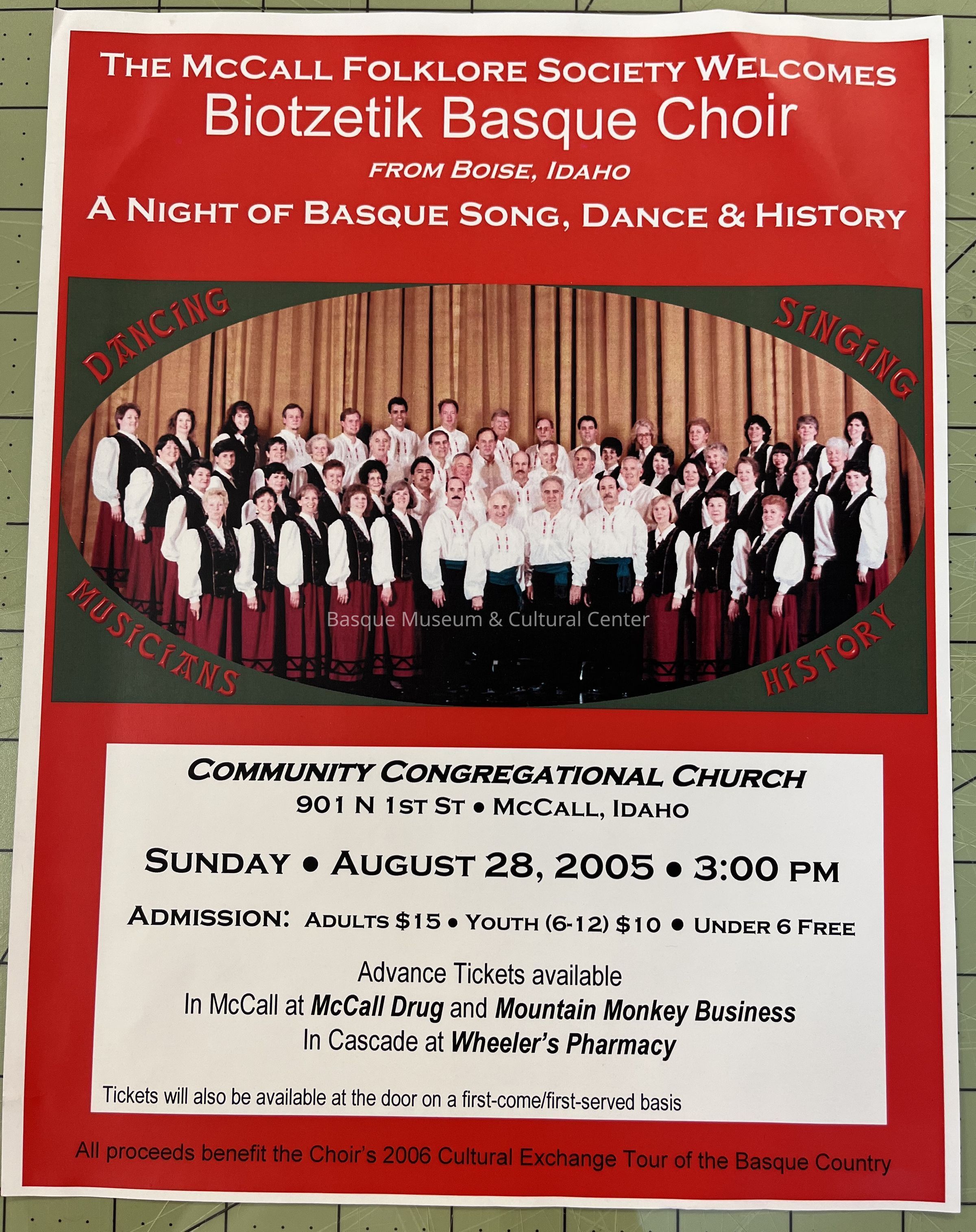 A poster of the McCall Folklore Society welcoming the Biotzetik Basque Choir for a night of "Basque Song, Dance, and History" on August 28, 2005. Includes information on the time, place, and address of the event, along with ticket prices and information on how to buy tickets. in the middle of the poster is a picture of the Choir.
