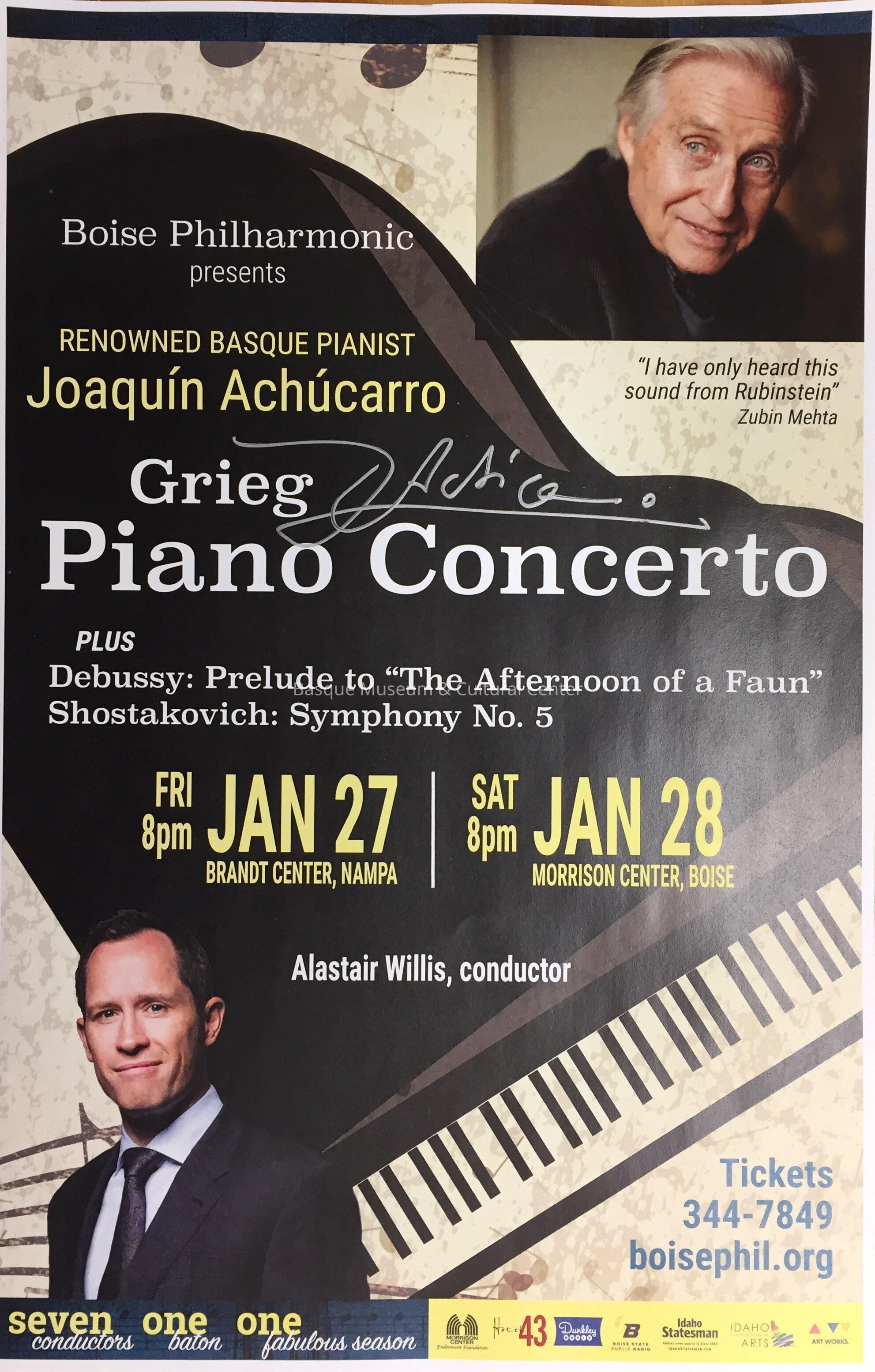 Full-color poster for a concert presented by the Boise Philharmonic - Alastair Willis, conductor - featuring Joaquin Achucarro performing Grieg Piano Concerto, in addition to Debussy's Prelude to 'The Afternoon of a Faun,' Shostakovich: Symphony No. 5. Performances were held on Jan. 27, 2017 (Nampa) and Jan. 28, 2017 (Boise). Poster is autographed by Achucarro.