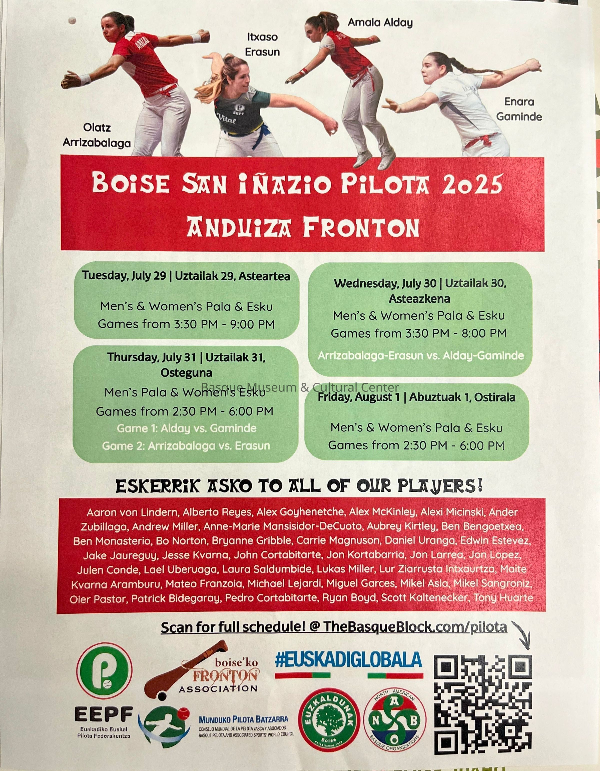 Color poster promoting the 2025 pilota competition at the Anduiza Fronton in Boise, Idaho. Includes photos of 4 female players, schedule of events, list of sponsors and players, and QR code for additional information.