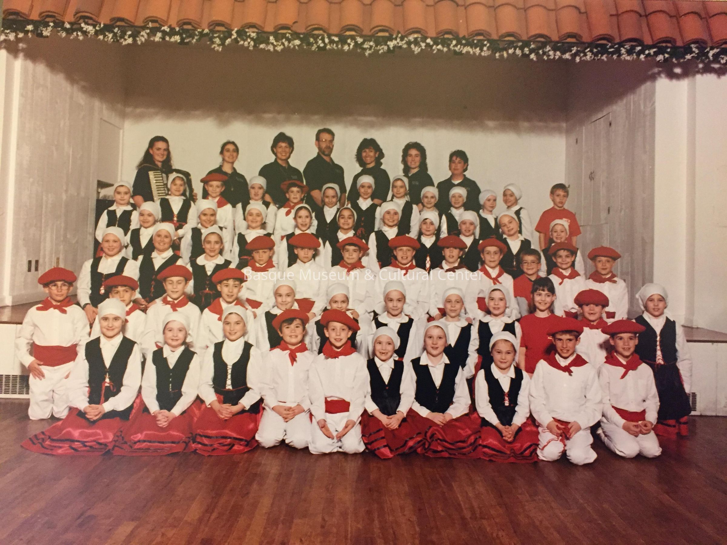Color photoprint of Boise'ko Gasteak dancers (ages 2-13), in costume, taken at Jaialdi 2000. Includes musicians and adult instructors. Individuals are not identified.