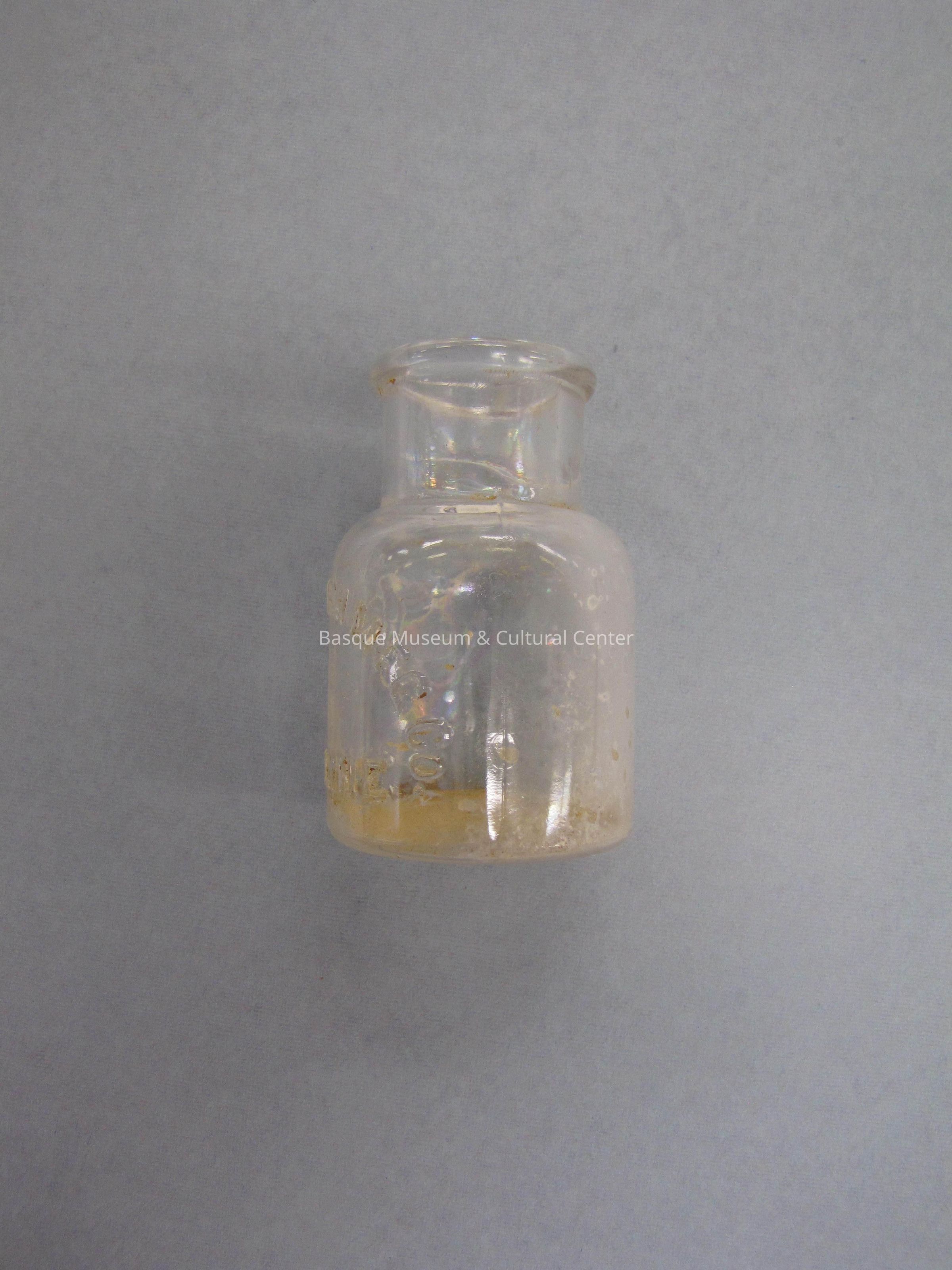 Small clear vaseline bottle; round base; raised lettering on front: Chesebrough MFG & Co Vaseline; brown acretions on base; minor irridescence on opposite side from lettering.