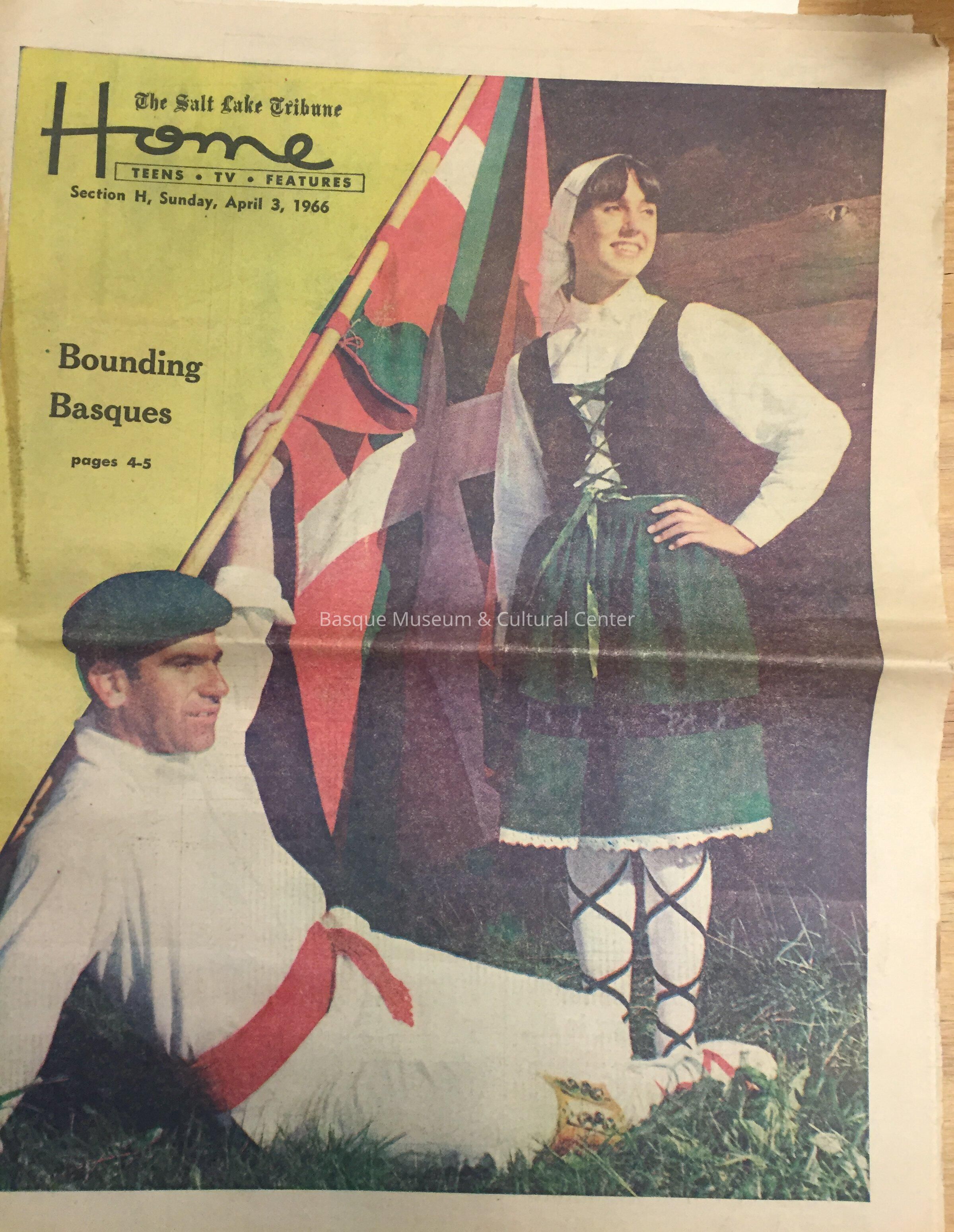 Partial section of newspaper from "The Salt Lake Tribune" Home section for Sunday, April 3, 1966. Contains article "Bounding Basques" by Carl E. Hayden on pp. 4-5. Cover photo features Al Erquiaga and Connie Amorebieta.