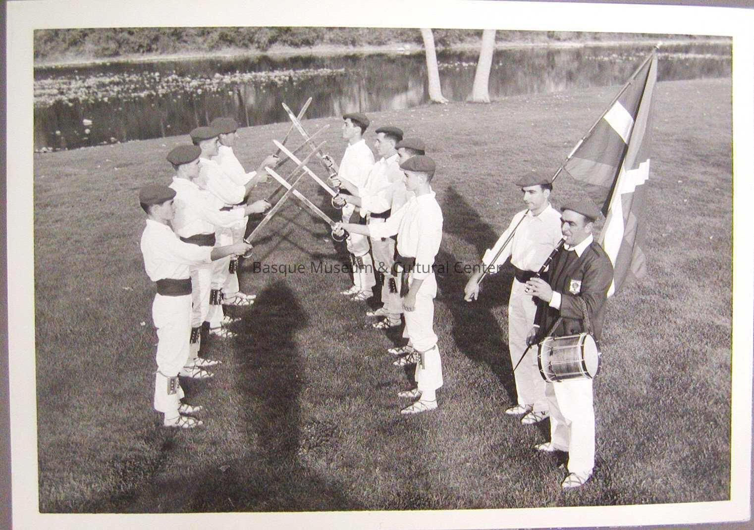 One 5" x 7 1/8" black and white photographic print. Photo is of Oinkari Basque dancers, male, with swords and accompanied by txistulari and flag-bearer outdoors.