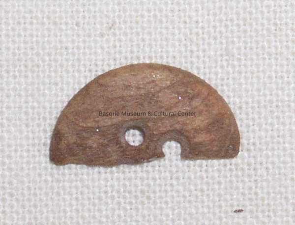 Half of a wooden button found in the parlor of 607 Grove Street during an archaeological excavation. The button appears to have had four holes going through the center. The wood is a medium to light brown with a distinct grain pattern. Both sides are slightly rounded, with rounded edges.