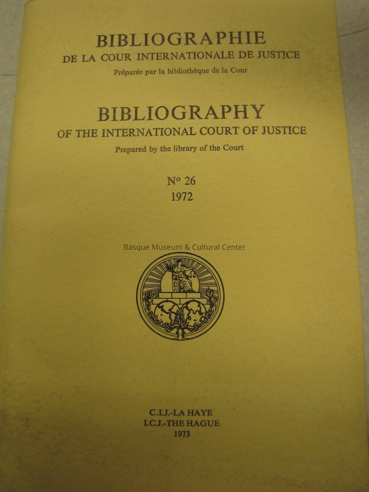 Bibliography in Spanish and English. Lists of references. Table of contents lists organization of topics. Prepared by the Court's private library. Cover is yellowish, textured cardstock. Title in Spanish then English below. Symbol in center of the International Court of JusticePublication Details