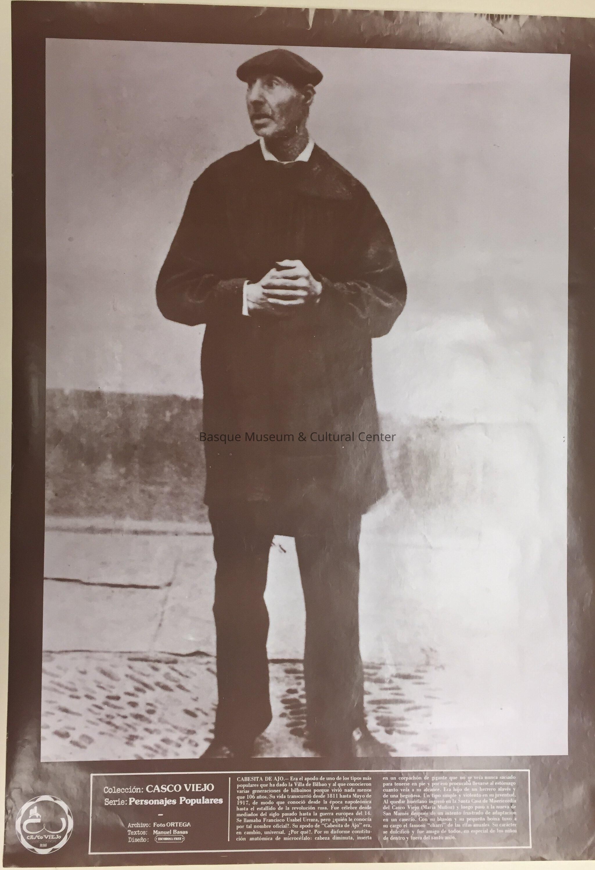 Sepia-tone poster of Francisco Usabel Urraza (1811-1917), wearing a traditional smock and beret and standing in an unidentified location, probably in Bilbao. Biographical text box, in Spanish, at bottom of poster.