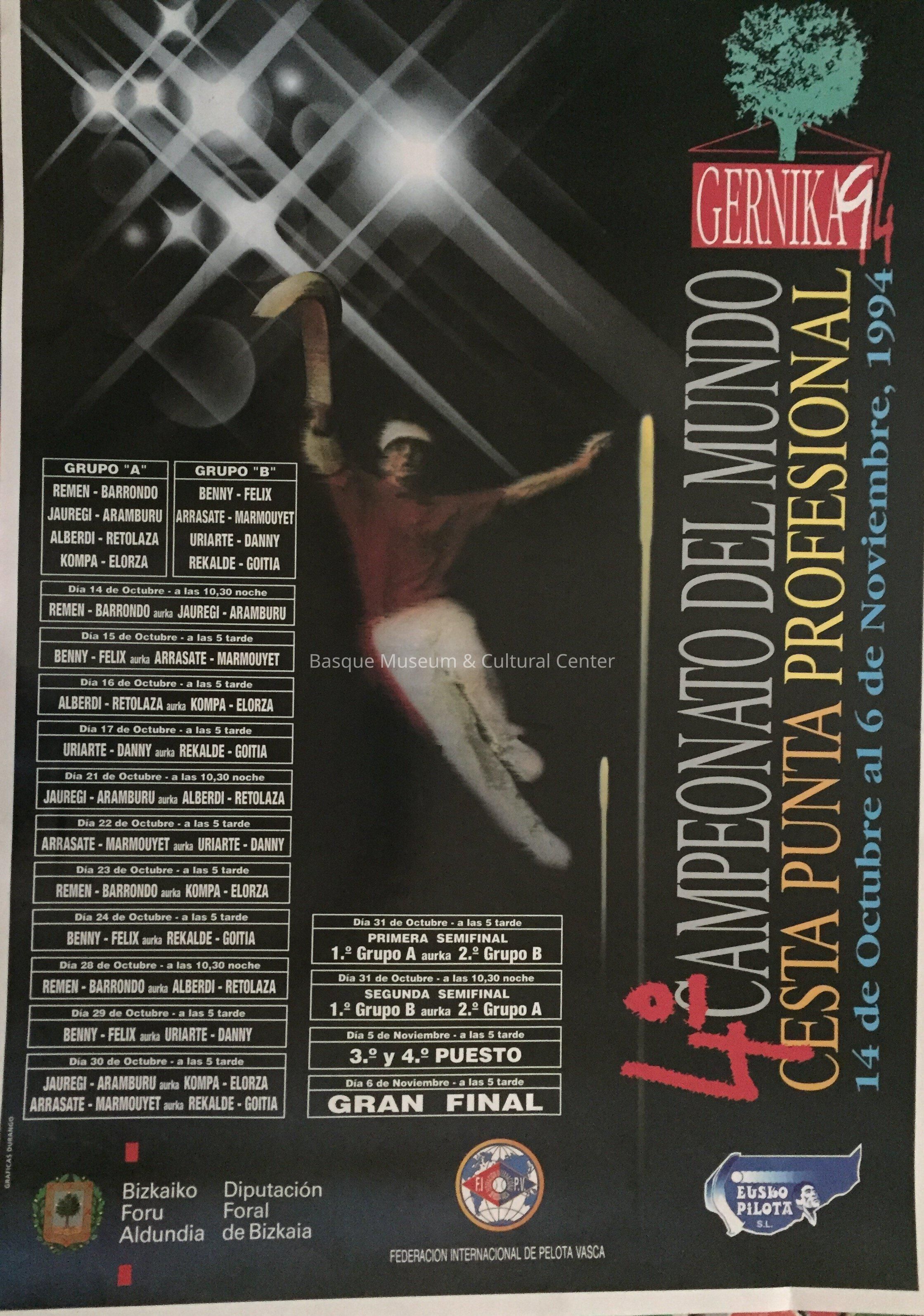 Full-color poster for a world championship Cesta Punta competition held in Gernika, October 14 through November 6, 1994. Includes a daily schedule listing the competitors. Published by Bizkaiko Foru Aldundia/Diputacion Foral de Bizkaia. [note: cesta punta is known as jai alai in English]