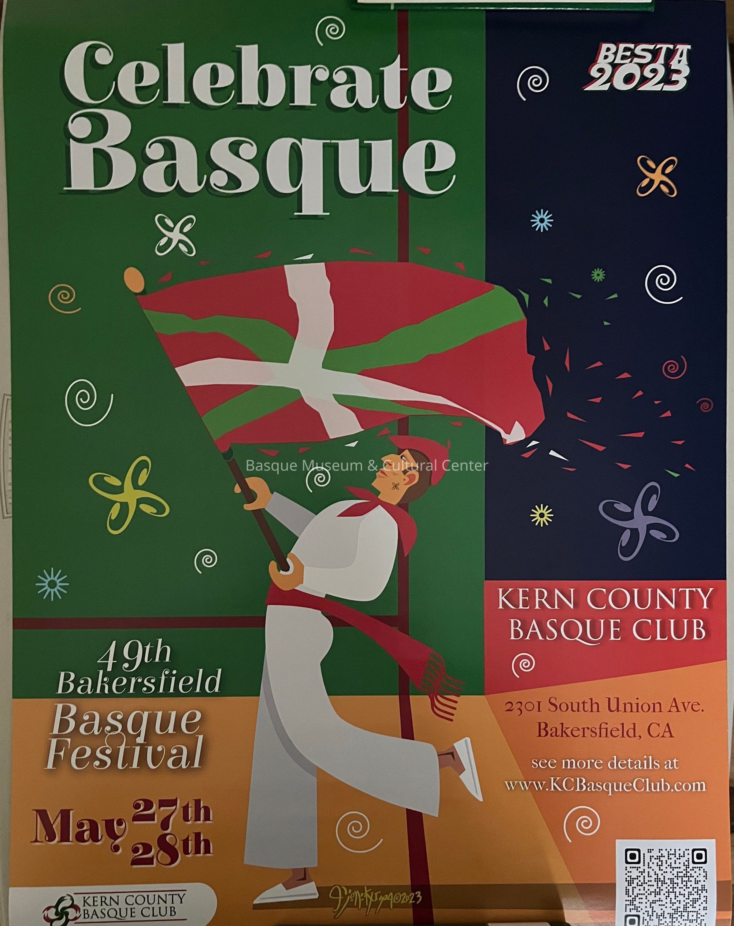 Full-color poster promoting the 49th Bakersfield Basque Festival to be held on May 27 and 28, 2023. Features a drawing of a male Basque dancer carrying an ikurrina, contact information, sponsors, location and a QR code.