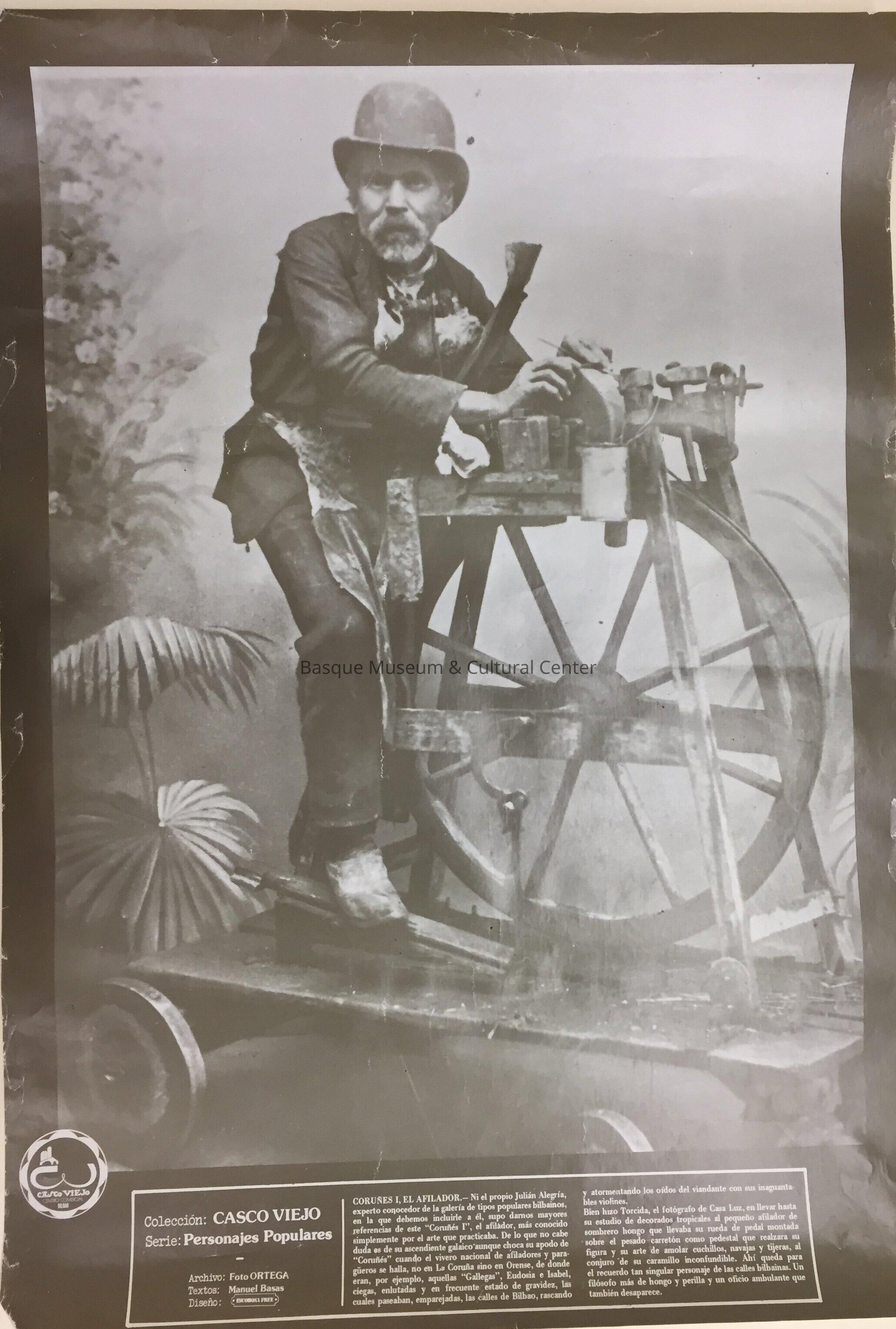Sepia-tone poster of Julian Alegria sitting on a hand/foot-operated sharpening/grinding stone. Biographical text box, in Spanish, at the bottom of the poster.