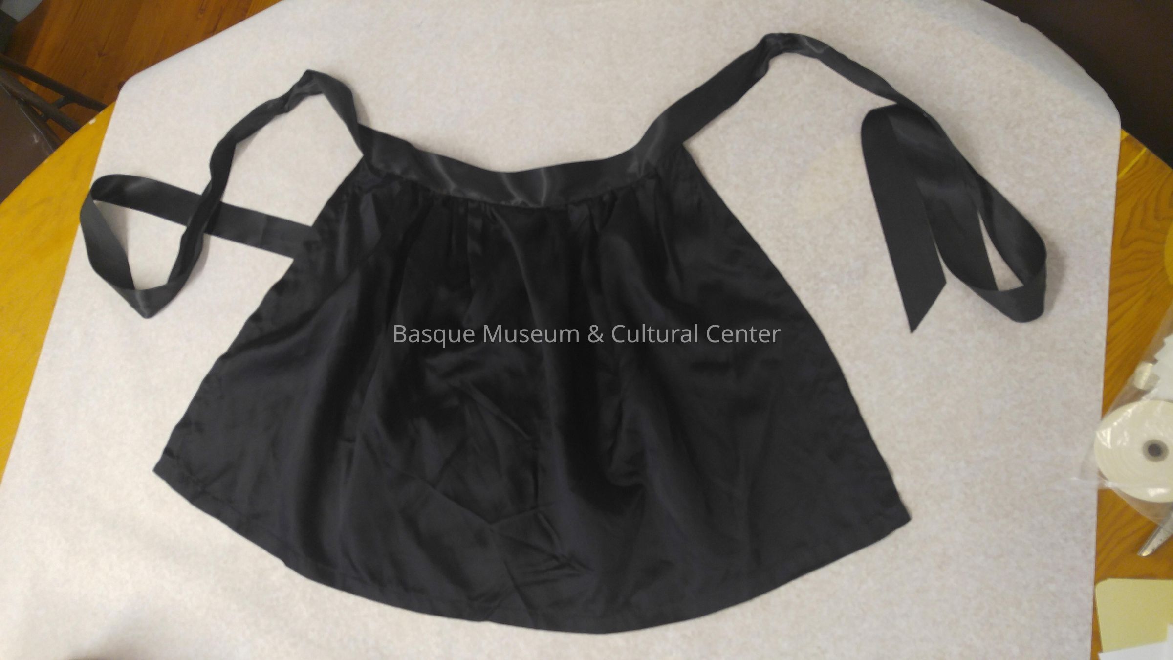 Black satin apron, commonly paired with a dance dress worn by the Onikari dancers. There's a waistband with ties at the top of the apron. Slight ruching between the apron and waistband.