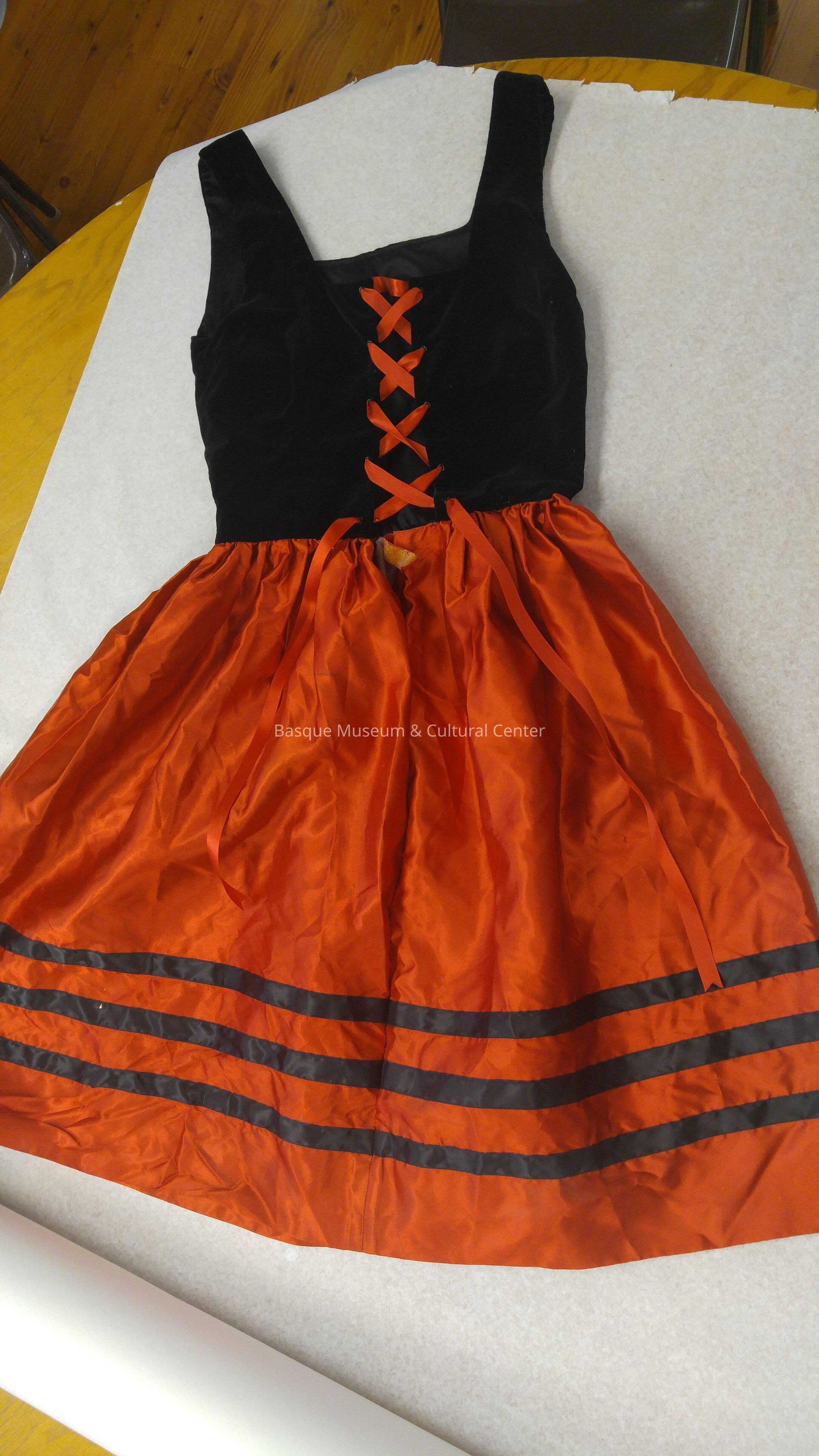 Sleeveless dancing costume; Skirt is bright red satin material, full skirt, gathered at waist; Three black stripes horizontal in middle of skirt, encircling it; Bodice is black velvet, open in front with black metal rivets to run a red silk ribbon through; Velcro strap on front side between bodice and skirt.