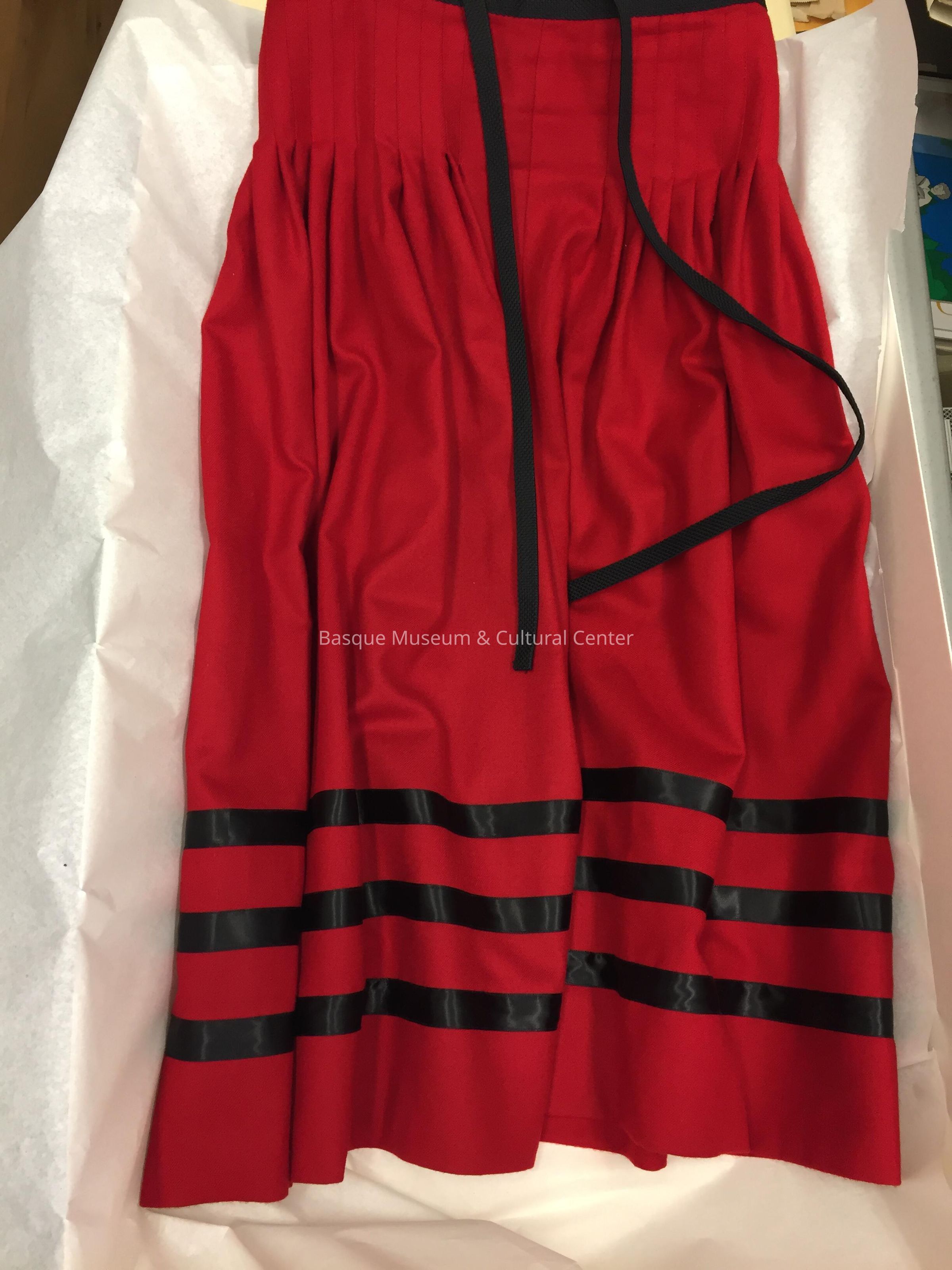 Three piece dance costume consisting of skirt (a), vest (b) and apron (c). Skirt is red wool with 3 parallel rows of black satin ribbon around the lower edge, pleated at the waist and with a black binding around waistline that also serves as the tie fastener. Fitted vest is black wool, fully lined, and with a front closure consisting of grommets with black satin ribbon. There is a sewn-in label at center back of lining - "A. Bilbao." Short apron of black cotton with lace edging and waistband that serves as tie fastener.