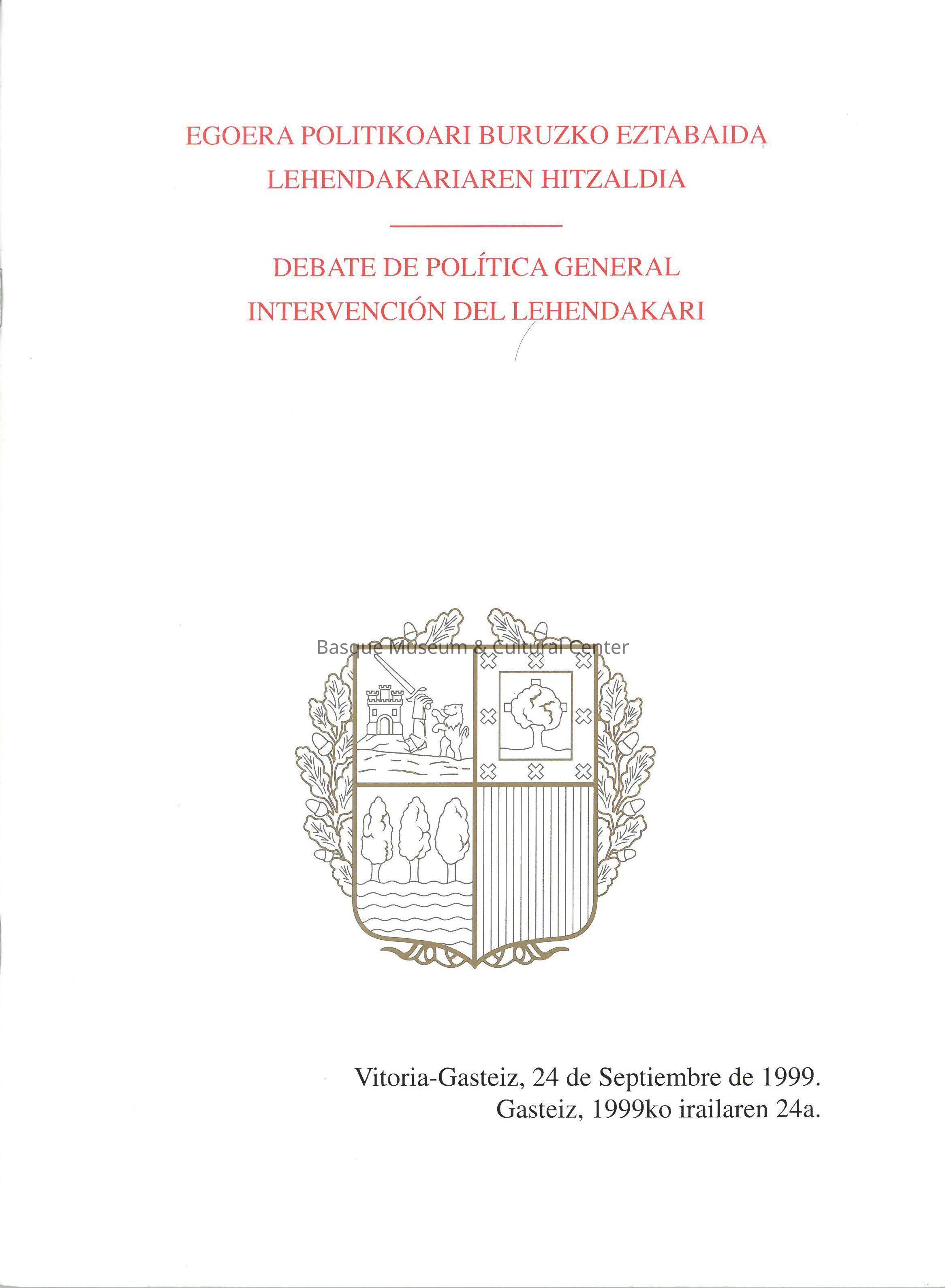 Egoera politikoari buruzko eztabaida : Lehendakariaren hitzaldia : Gasteiz, 1999ko irailaren 24a = Debate de politica general : intervencio´n del Lehendakari : Vitoria-Gasteiz, 24 de septiembre de 1999Entry/Object ID