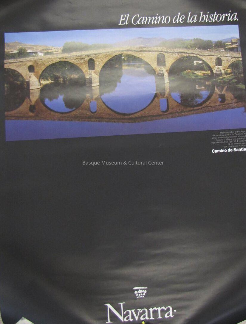 Navarra poster; "El camino de la historia." heading across the top, right justified; Image Camino de Santiago, stone bridge with arches over water, reflections of stone bridge in water, mountain in background, trees; Spanish text says "El puente sobre el rio Arga, que da nombre a la villa de Puente la Riena, inicio y construirse durante el reinado de Sancho el Mayor y se concluyo en la segunda mitad del siglo XI. Es conjuncion de los caminos europeas que conducen a Compostela. Camino de Santiago"; Black background.