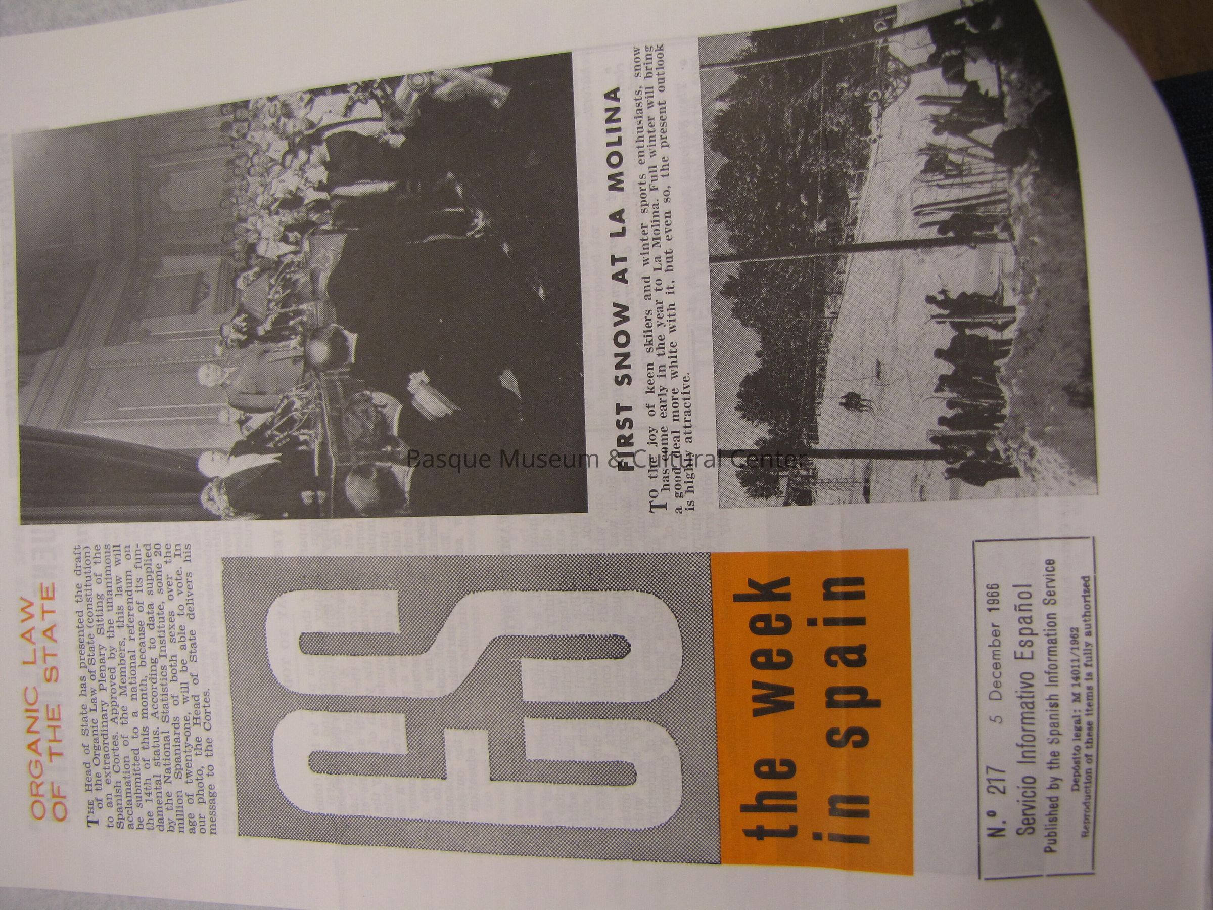 Magazine. Cover articles headlines in orange; "Organic Law of The State" and "First Snow at La Molina". Logo on the left side toward the bottom. "The week in Spain" over orange background. The rest in black and white. Picture of a press release and ski resort.