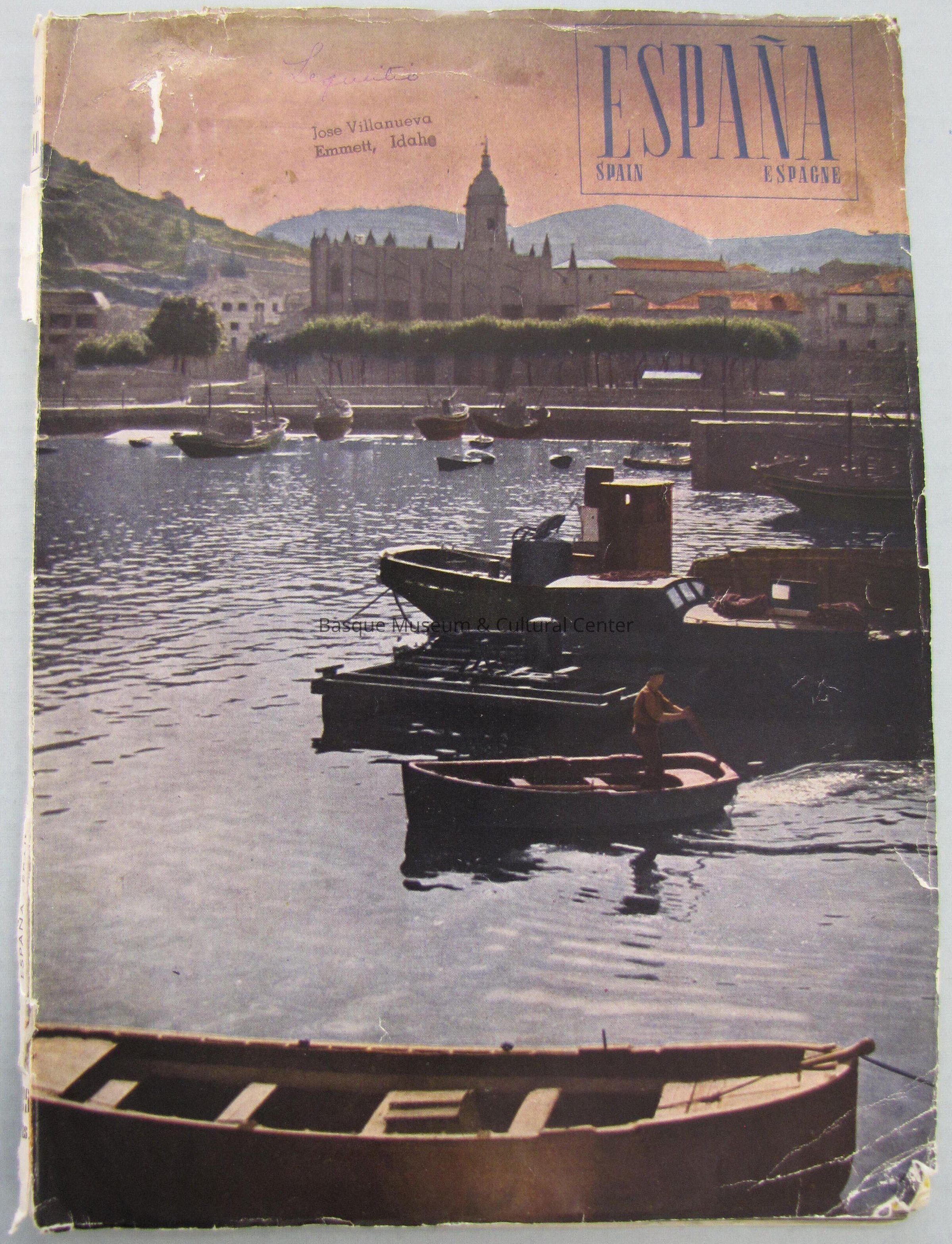 Edition of "Espana" magazine devoted to the Basque Country; the sender of this magazine outlined all mentions of the town of Lekeitio; issue includes Basque History, Maps of Bizkaia, writings on Bilbao, the Nervion, Casco Viejo, the mountains, Cattle in Derio, Fishing, and Industry; front cover is a photo of a sunrise on the port in Lekeitio; back cover is an advertisement for "Los Pequenos Suizos" shoes.