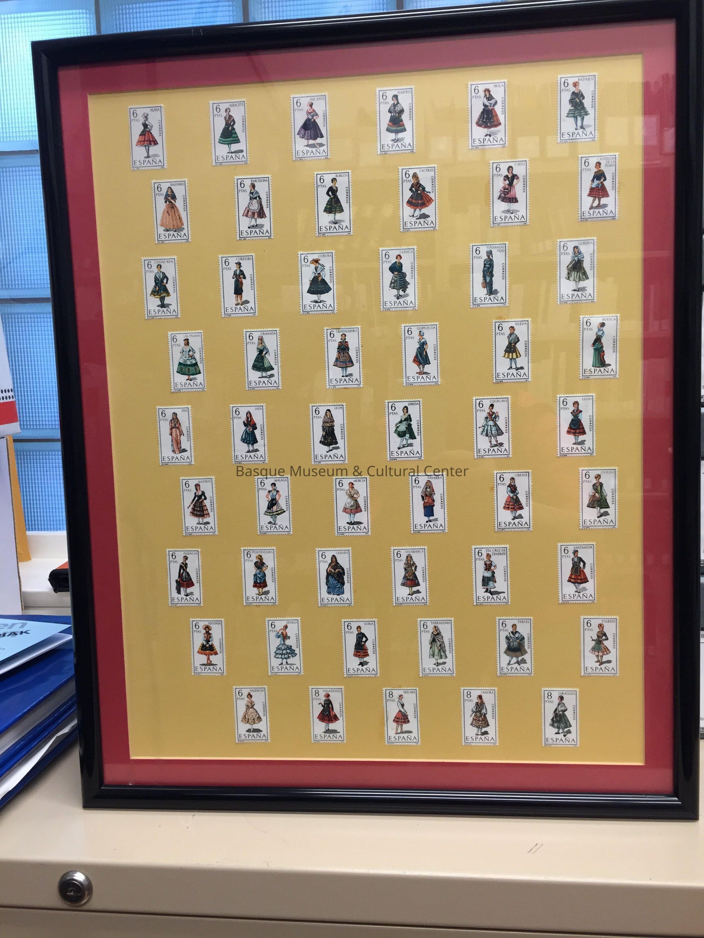 Framed poster showing 53 individual postage stamps from Spain, each showing the native dress of a different region of Spain, including the Basque County. Stamps are valued at 6 PTAS [pesetas] each. Black plastic frame, red matt and stamps are affixed to a gold-colored background. Size - 17" x 21".