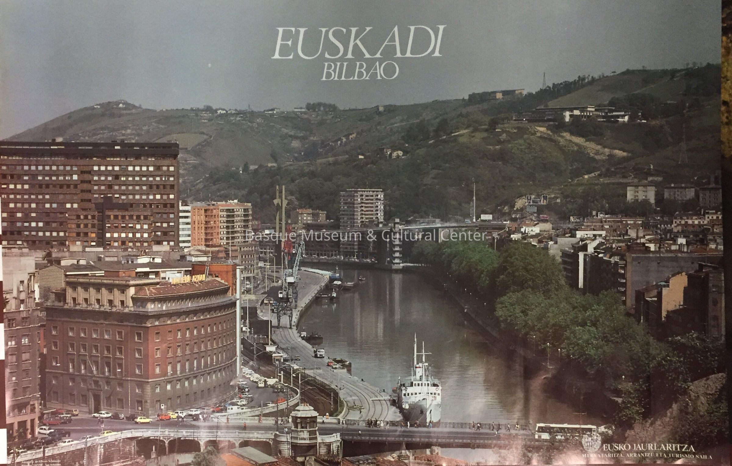 Color poster of Bilbao showing the river with buildings on each side and hills in the background. Photographer: Alberto Schommer; published by Eusko Jaurlaritza-Merkataritza Arrantzu eta Turismo Saila