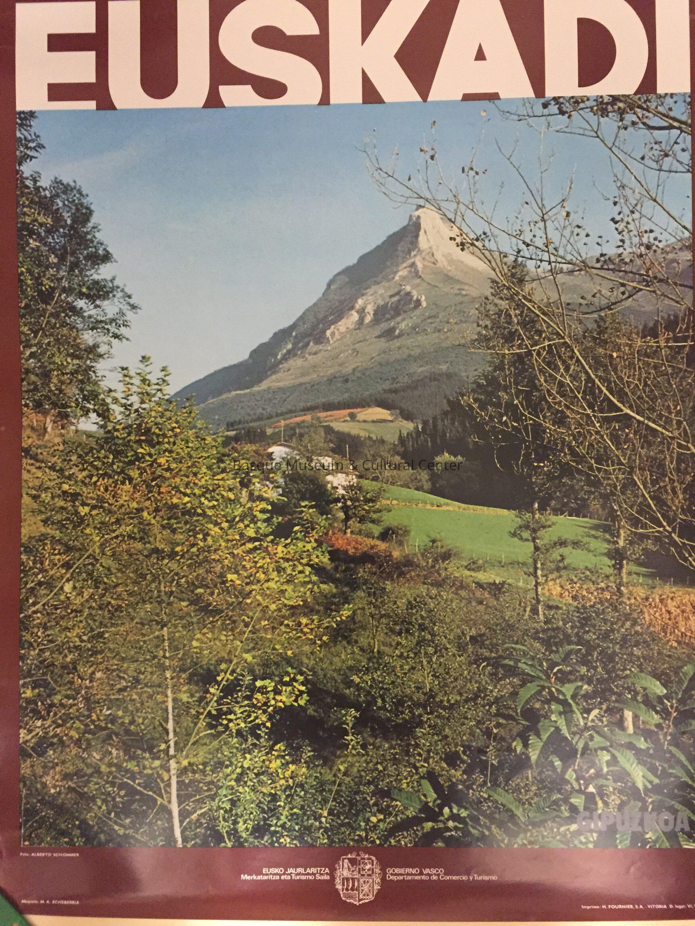 Color poster with a scene of Gipuzkoa province, with a baserri at the center and trees in the foreground and mountains in the background. Photo by Alberto Schommer; published by Gobierno Vasco, Departamento de Comercio y Turismo.