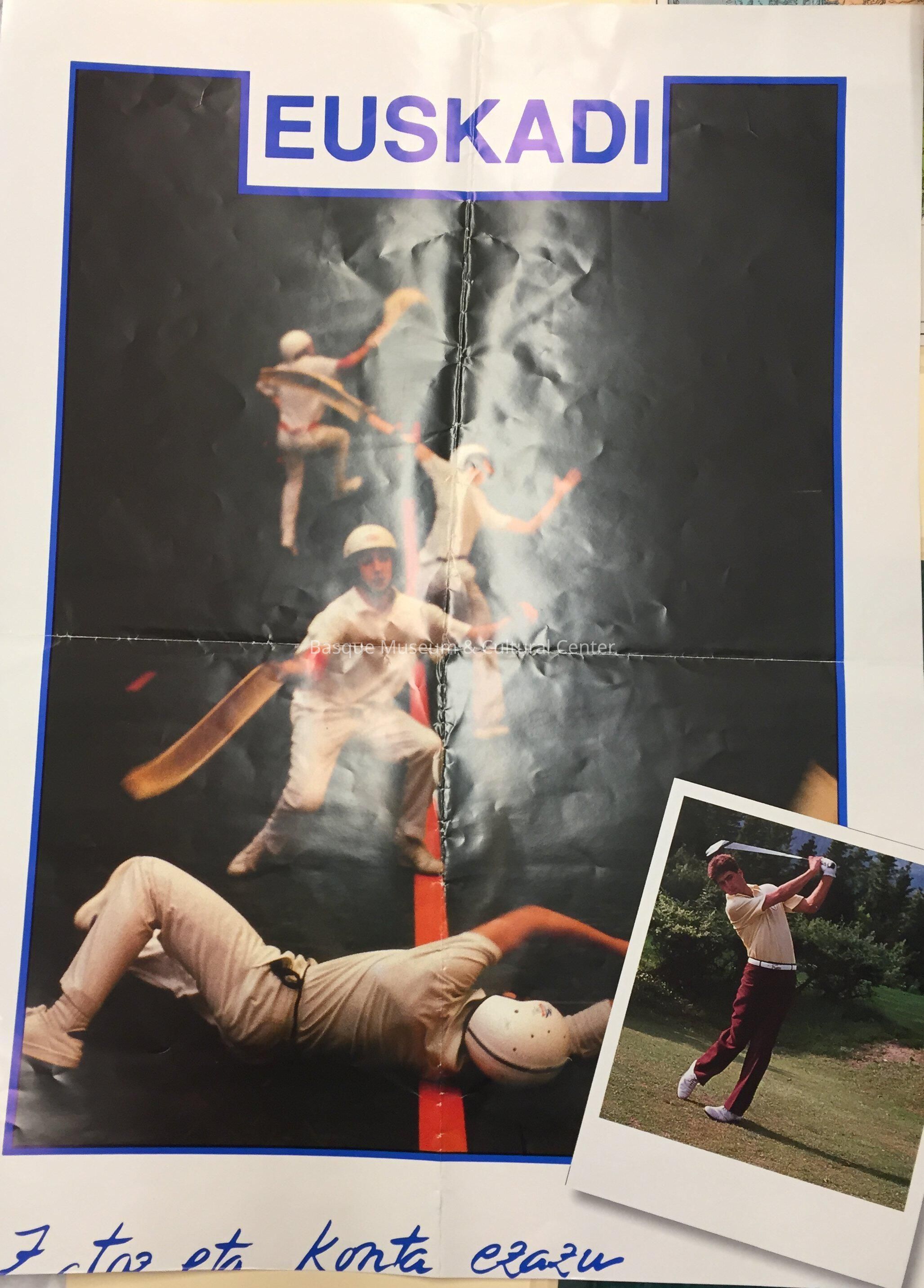 One white poster, with blue outline, of 4 men in Jai Alai uniforms playing Jai Alai, with a black background. Bottom right has image of golfer Jose Maria Olazabal swinging a gold club on a golf range. Poster title reads in blue lettering, Euskara "Euskadi zatoz eta konta ezazu" (Basque country: Come and tell).
