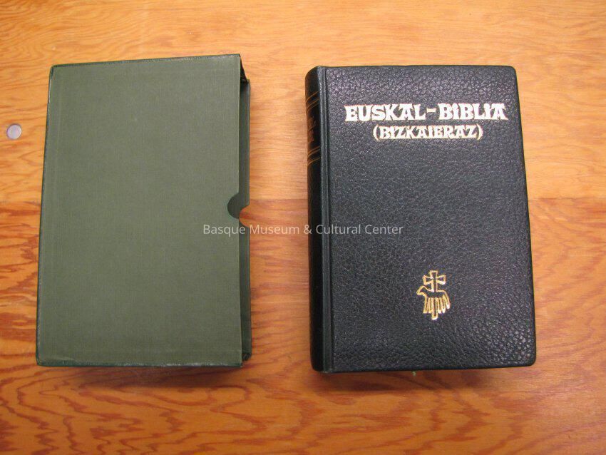 Book is bound in heavy green leather; in gold foil writing on front cover is, "Euskal - Biblia (Bizkaieratz); there is also a symbol at bottom of front cover that is a sheep outline with a cross outline behind it; the same title and symbol are visible on the spine of the book; bible was published in Bilbao, Biakaia in 1976; pages are trimmed in gold; 1,896 numbered pages, all written completely in Euskera; spine of book has black field behind title with gold borders; above and below this field are thick black lines with thin gold lines above and below; bible has a single green ribbon coming from top to bottom that is used as a page holder or bookmark; book came in a 5-sided cardboard case
