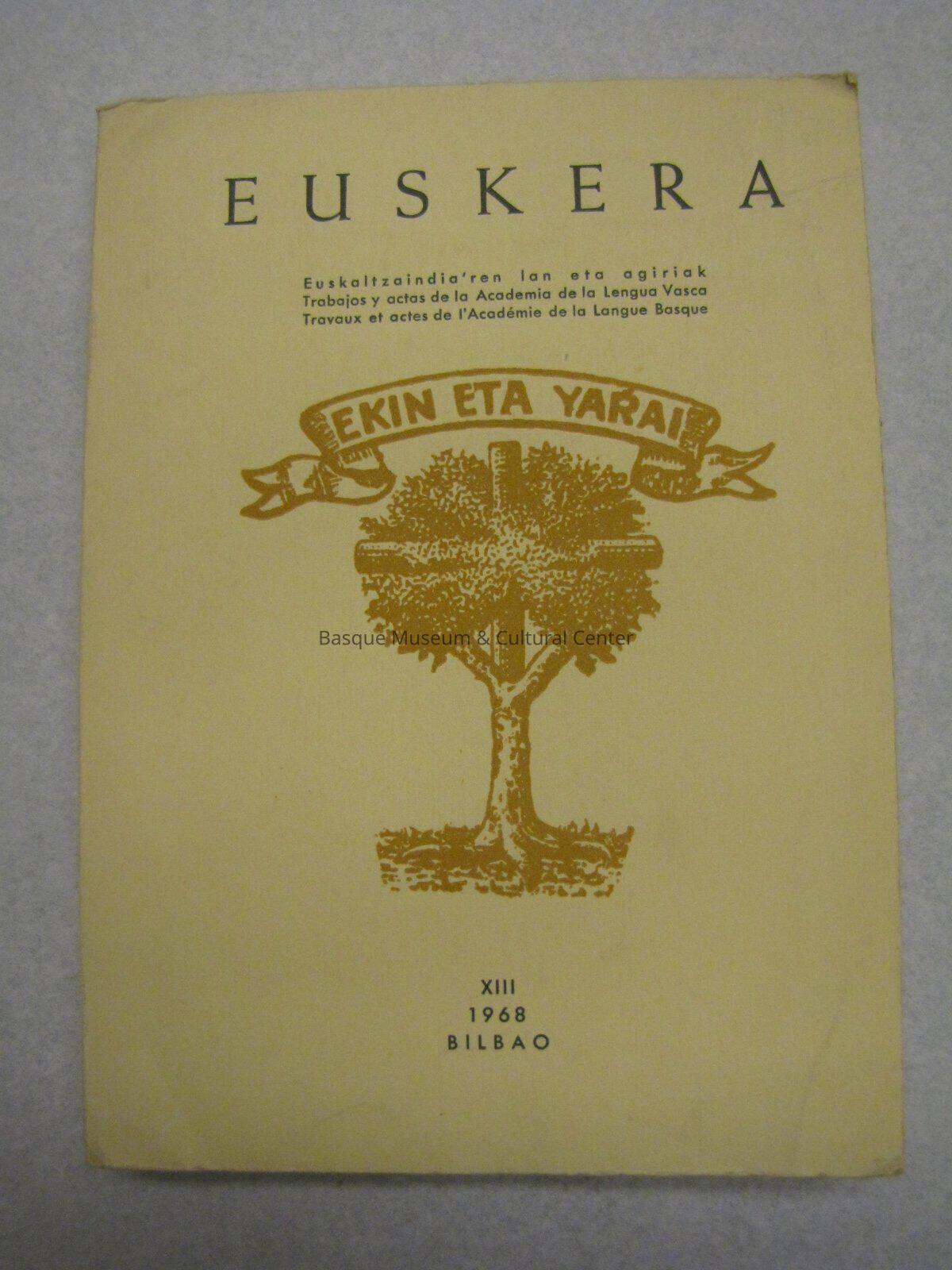A book about learning the Basque language. 351 pgs. Cover is yellowish. Title on top in green, subtitle text below. Center is a dark yellow print of a tree build on a cross. A banner above it reads "Ekin Eta Yarai"