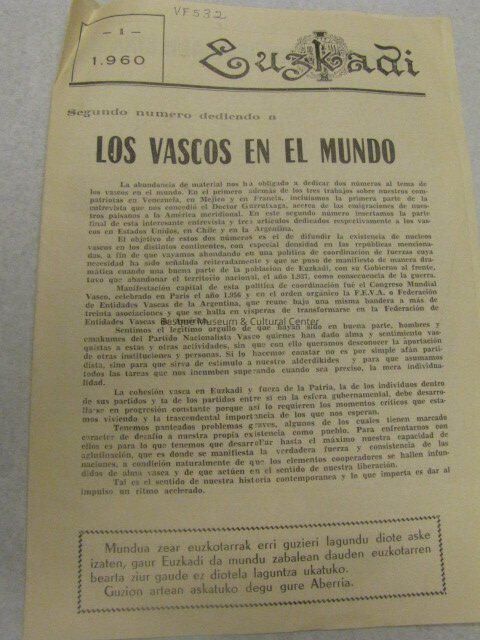 Small paper news packet. Called Euzkadi, the title has a crest in the background at the "k". Writing on the top edge says VF532in pen. On the top left corner there is a small box ith 1 1.960 in it. The headline for the front page is "Los Vascos en el Mundo" It is 8pages long and talks about Basques in different locations such as Argentina, Chile, and America.