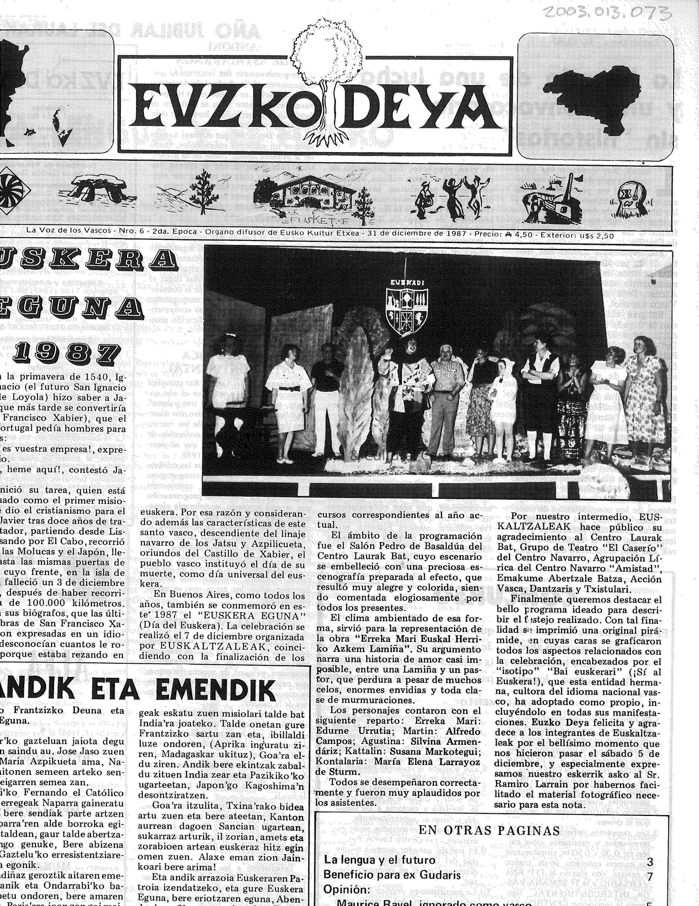 A copy of the December 31, 1987 Euzko Deya newsletter from Argentina.