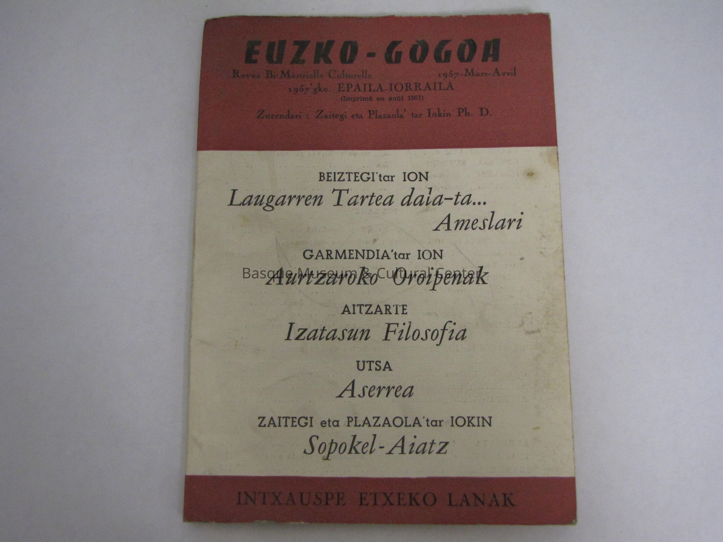 Euzko-Gogoa Revue Bi-Mestrielle Culturelle Mars-Avril 1957 Epaila-Iorraila Intxauspe Exteko Lanak v. ; 17 cm