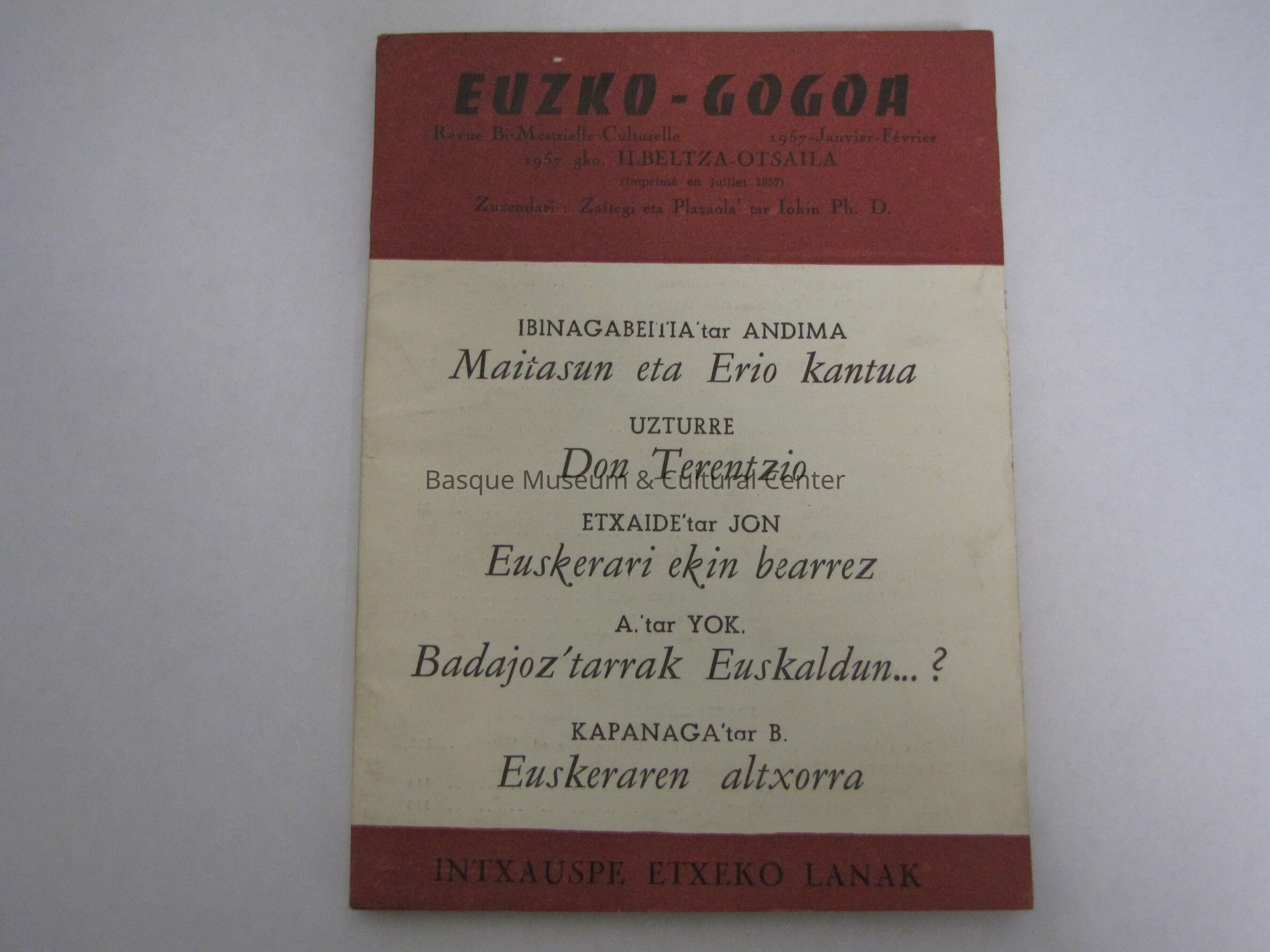 Euzko-Gogoa Revue Bi-Mestrielle Culturelle Janvier-Fevrier 1957 Ilbeltza-Otsaila Intxauspe Exteko Lanak v. ; 17 cm