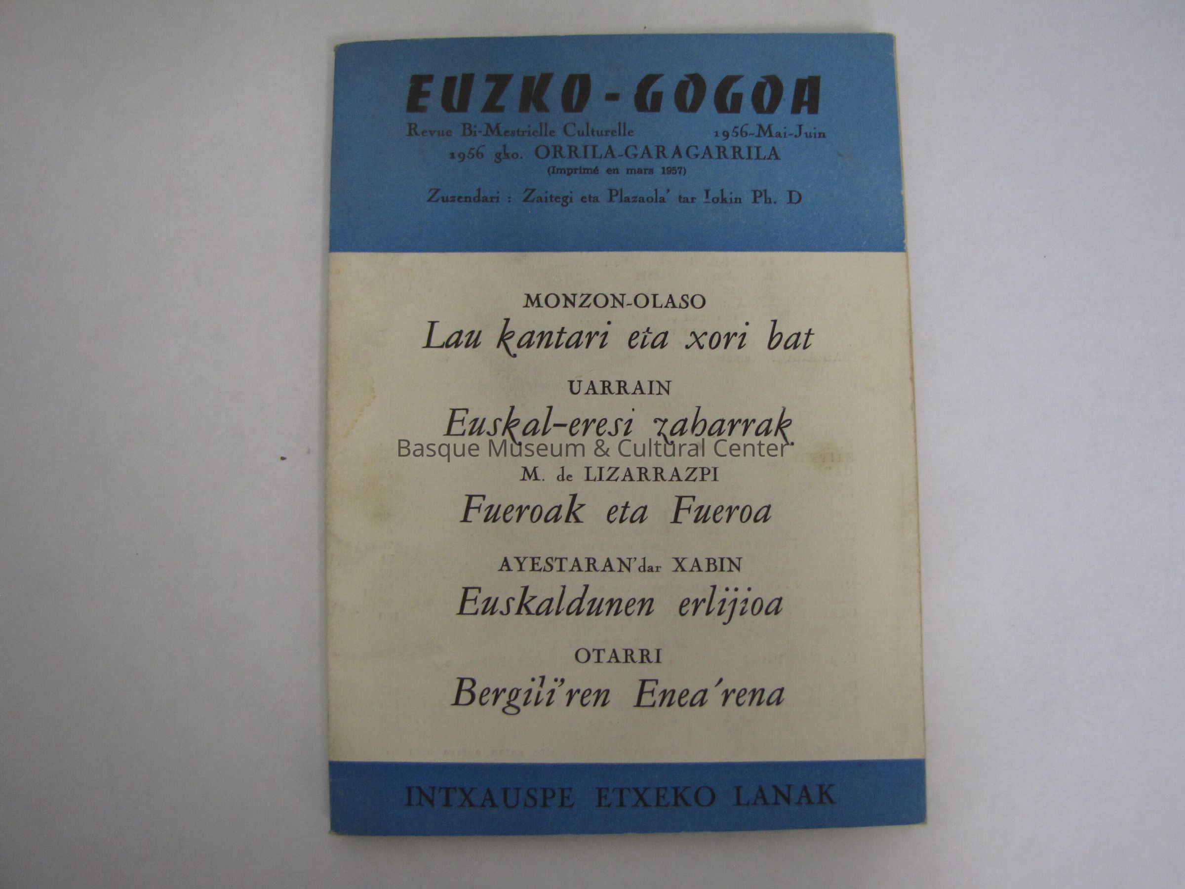 Euzko-Gogoa Revue Bi-Mestrielle Culturelle Mai-Juin 1956 Orrila-Garagarrila Intxauspe Exteko Lanak v. ; 17 cm.