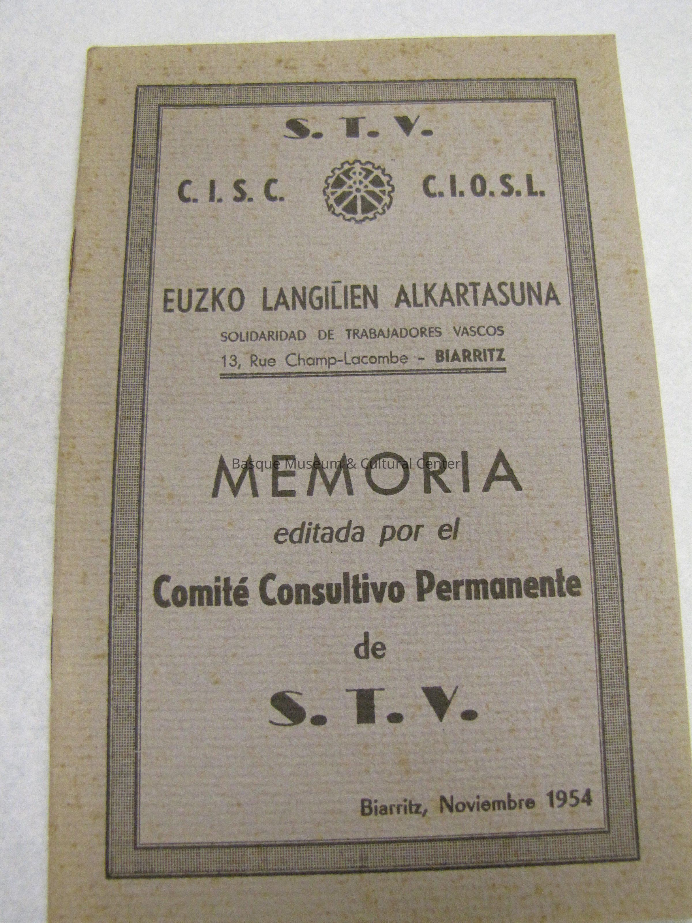 Small Booklet stapled together with a puple tinted cover that says S.T.V. at the top and C.I.S.C. C.I.O.S.L. on either side of an emblem. Below the title is solidaridad de trabajodores vascos 13, Rue Champ-Lacombe -Biarritz
