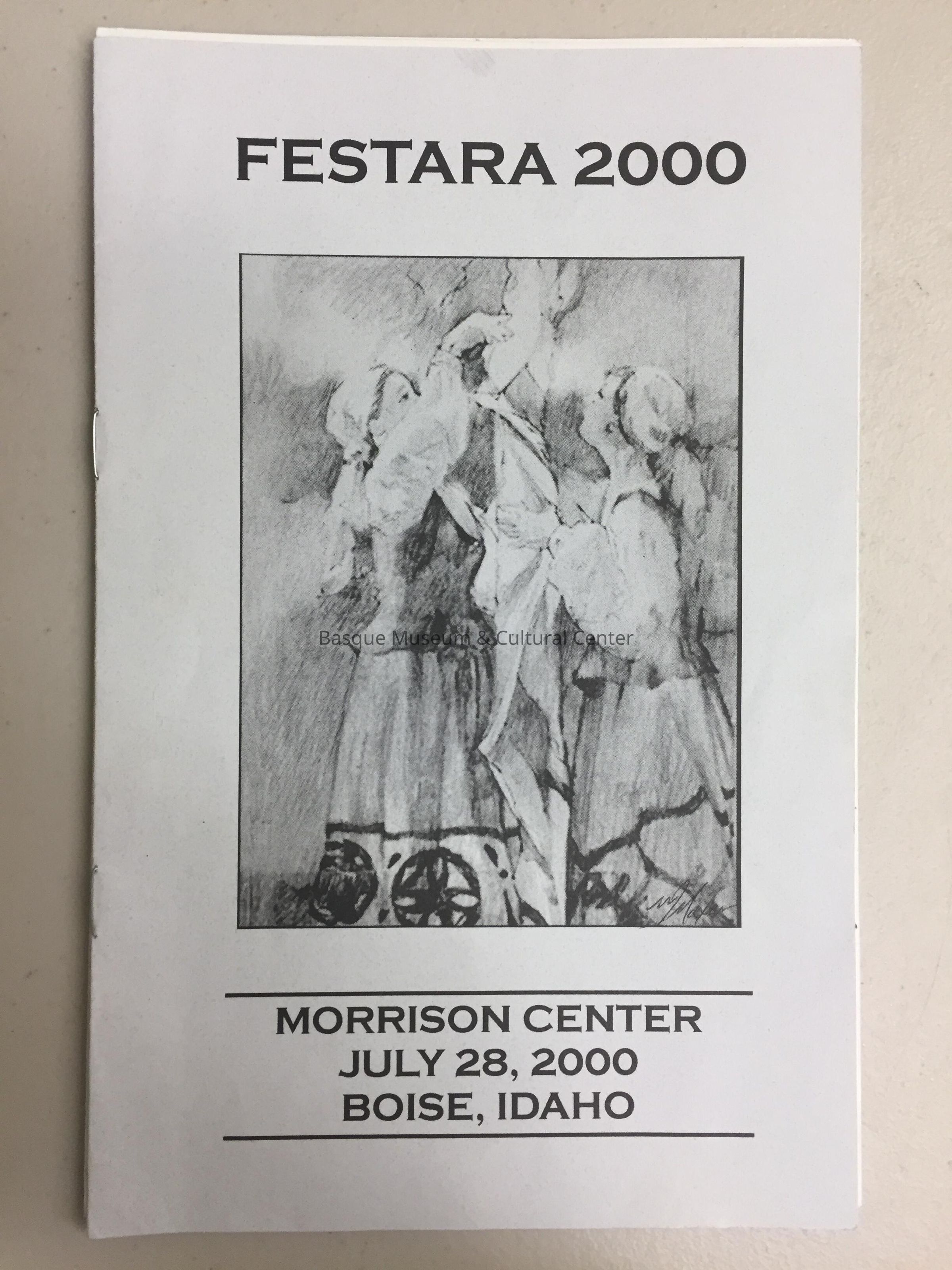 Printed program from Festara, a musical event held as part of Jaialdi at the Morrison Center for the Performing Arts on July 28, 2000. Includes information about the musical and dance groups - Txorimaloak Soinu Taldea, Arkaitz Dantza Taldea, Tapia eta Leturia, Roberta eta Kepa and Oinkari Baque Dancers - the program itself; definition of "bertsolariak" (professional improvisers); and acknowledgements.