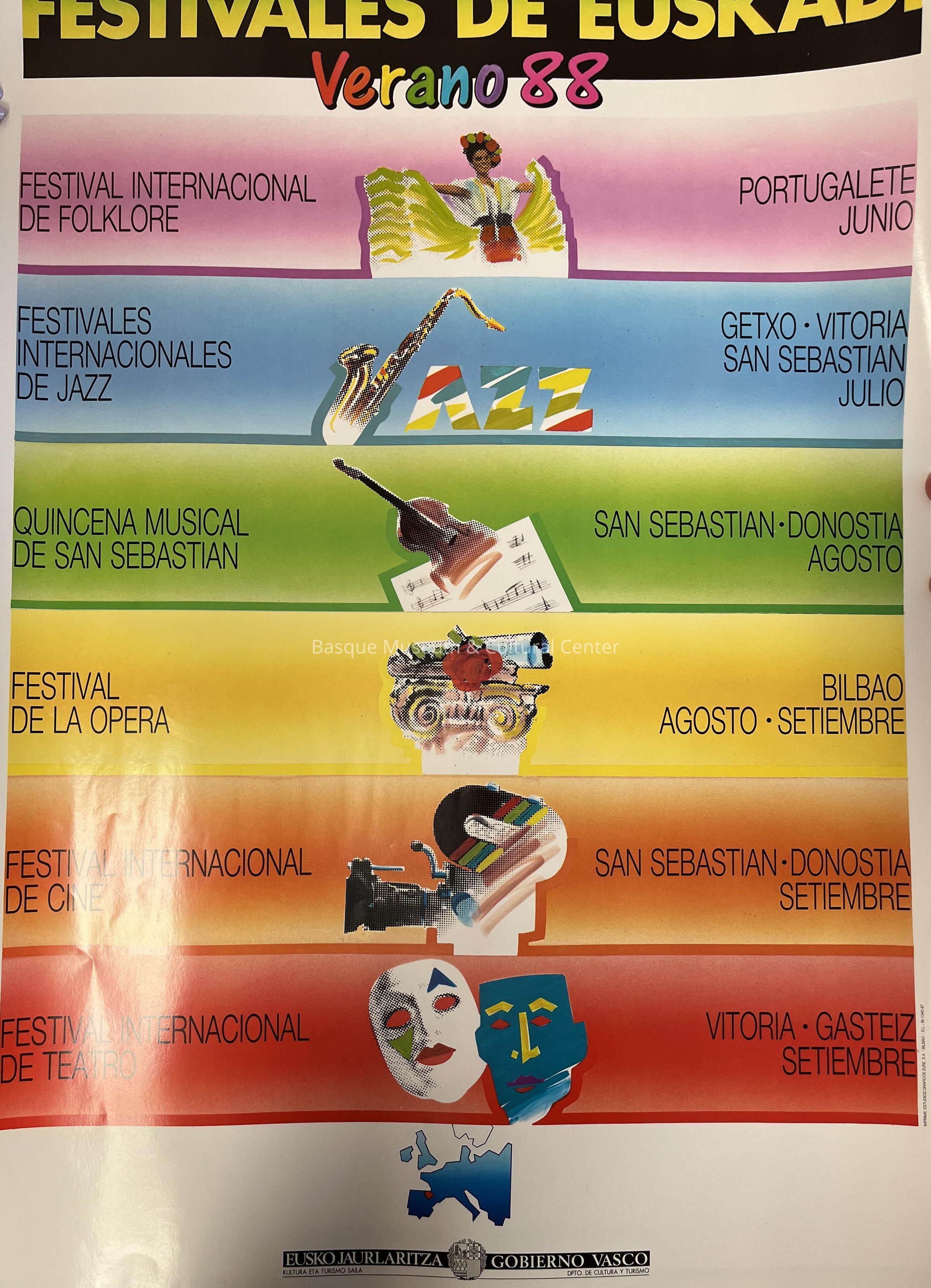 Full-color poster promoting Basque festivals of summer, 1988 in various cities, including Vitoria-Gasteiz, Donostia-San Sebastian, Bilbao, Getxo and Portugalete.