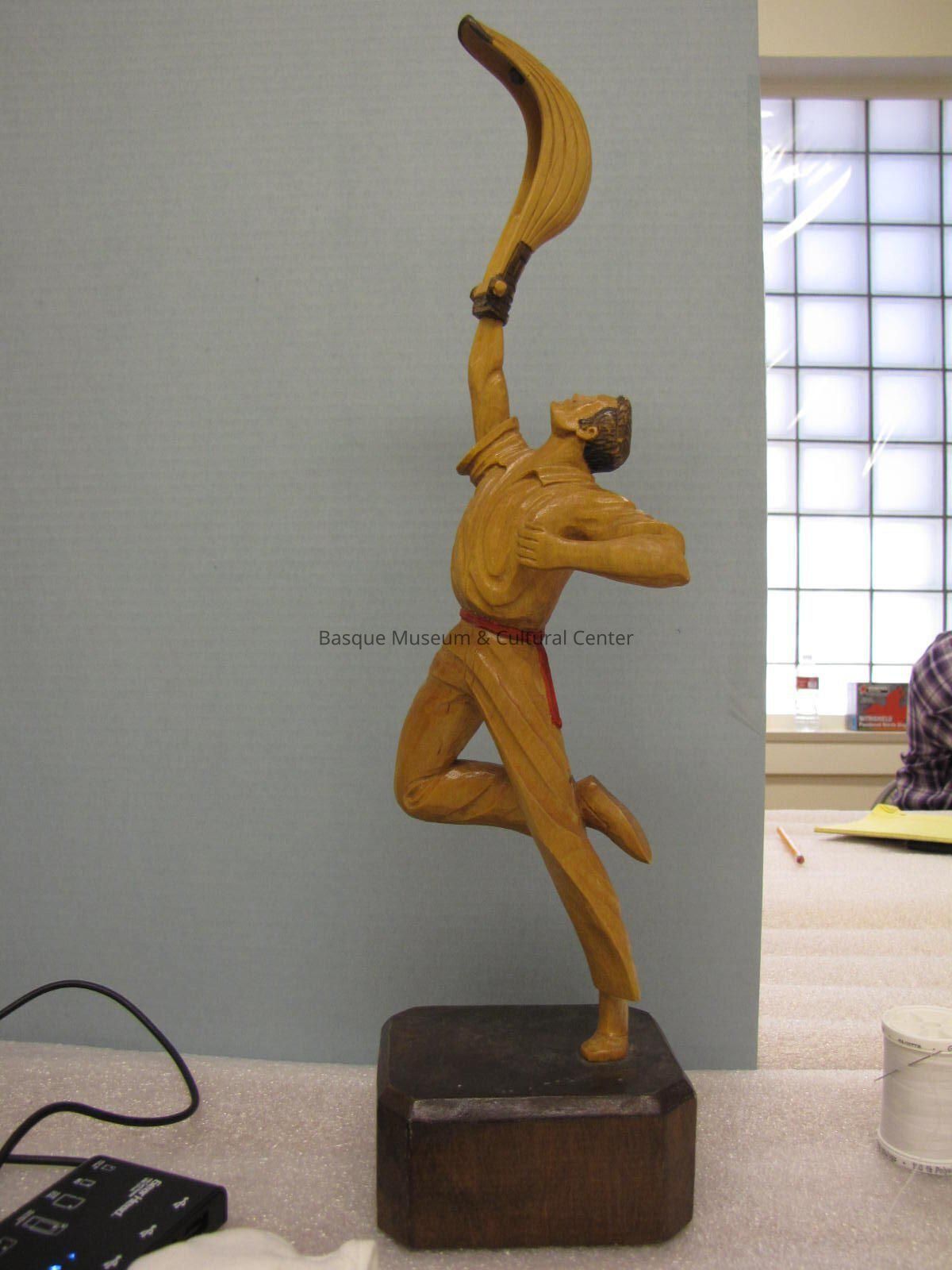 Wooden Figurine; Wood Base; Jai-alai Player; "J. Alberdi" Carved into Base; All natural wood color and stain except for red waist sash. 4 3/4"x4 1/4"x18 1/4"