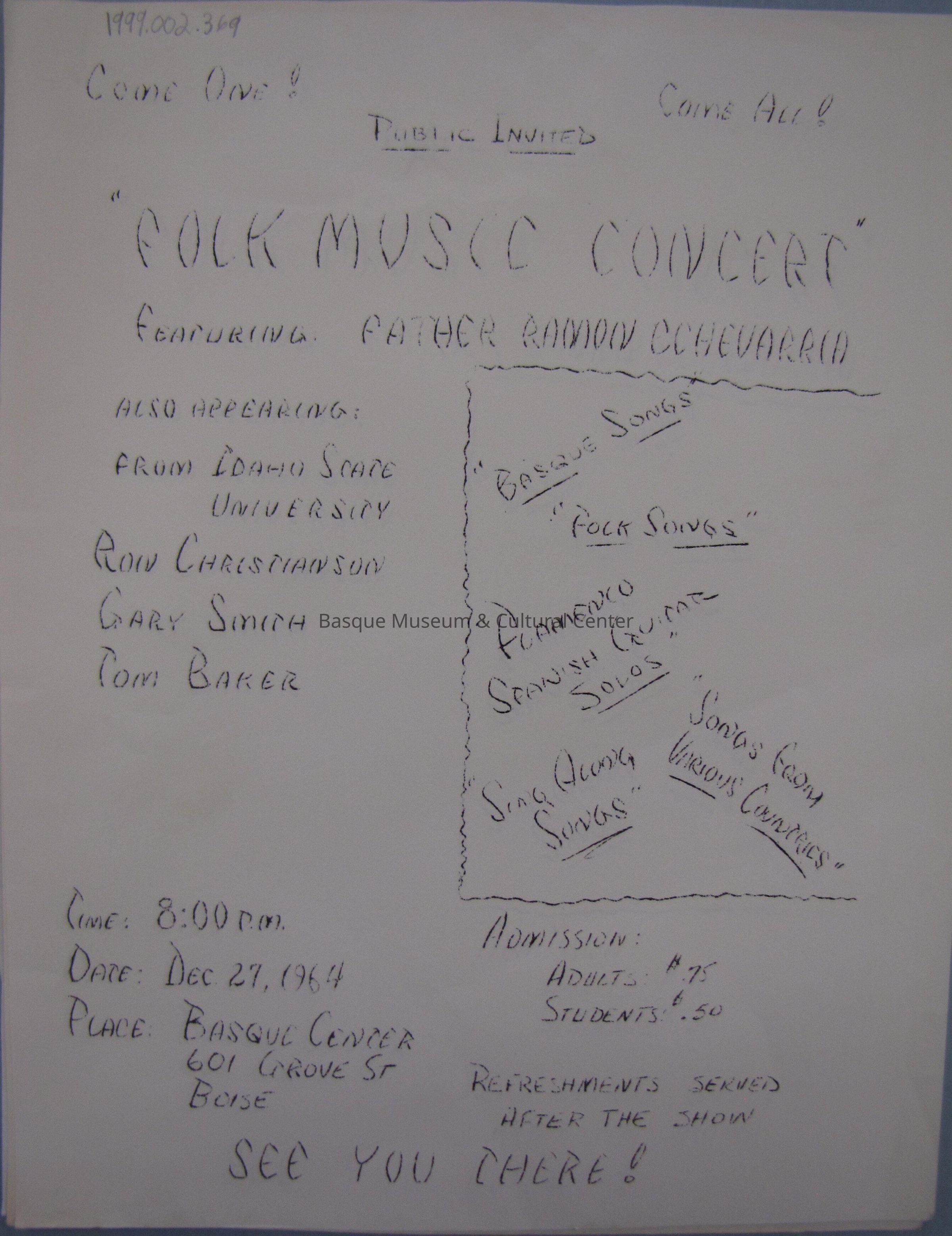Two copies of a poster advertising a folk music concert featuring Father Ramon Echevarria; held at the Basque Center in Boise; also appearing are Ron Christianson, Gary Smith, and Tom Baker; Event was held on December 27, 1964; attached to the posters is a letter from Jerry Swinney at the Idaho Historical Society to Lee; letter talks about Jerry joining the Basque Ladies sewing club and that the "stamps" attached are from Caracas