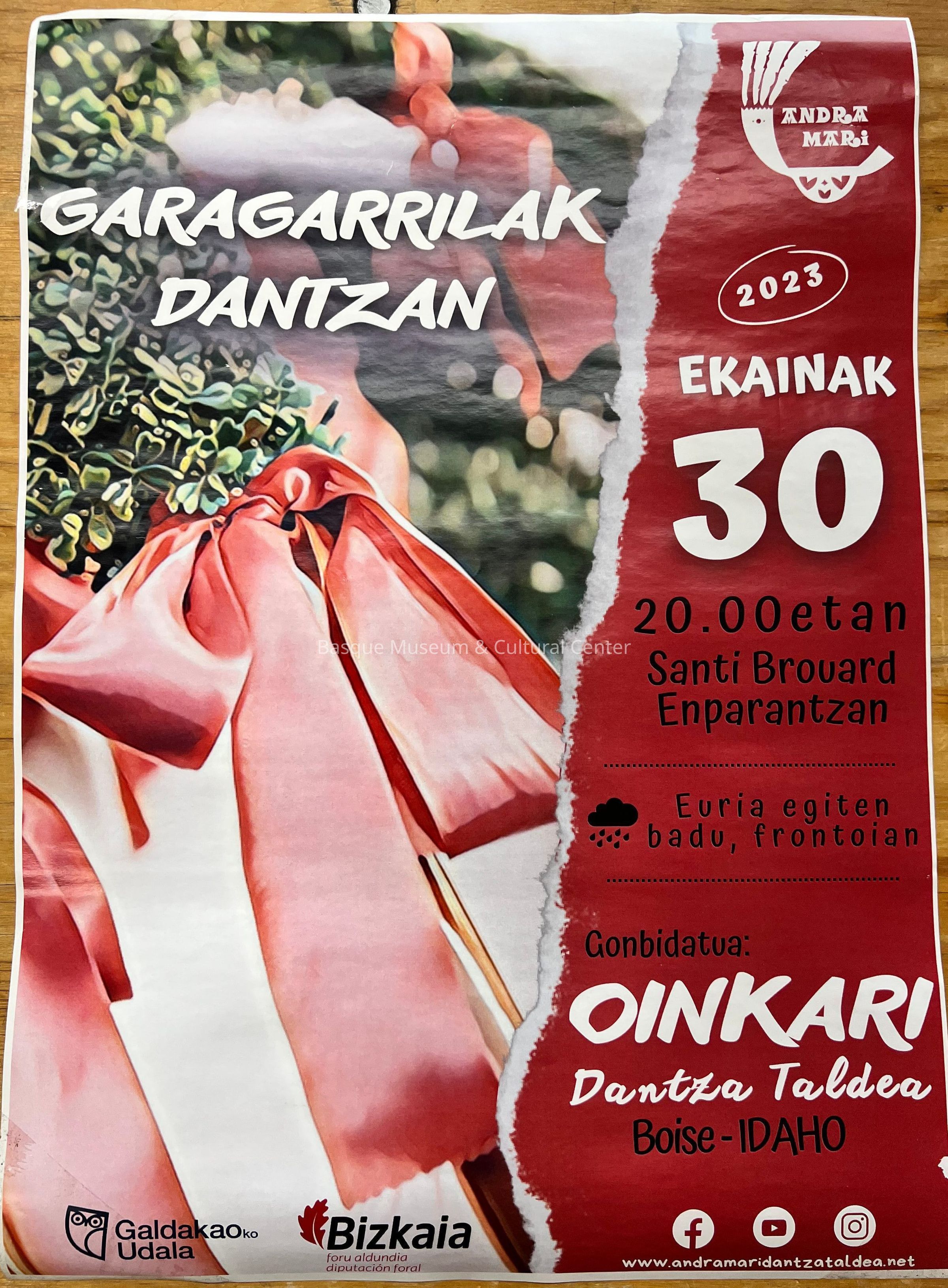 Full color poster promoting a joint performance of the Oinkari Basque Dancers and Andra Mari Dantzari Taldea. The performance took place on June 30th, 2023. The left side of the poster features an image of an "ustai handi," or big hoop in the background with "Garagarrilak Dantzan" printed over the top. The right side of the poster includes information about the time and location of the event, inclement weather plans, and information on the Oinkari Basque Dancers. Sponsors of the event are listed along the bottom of the poster.