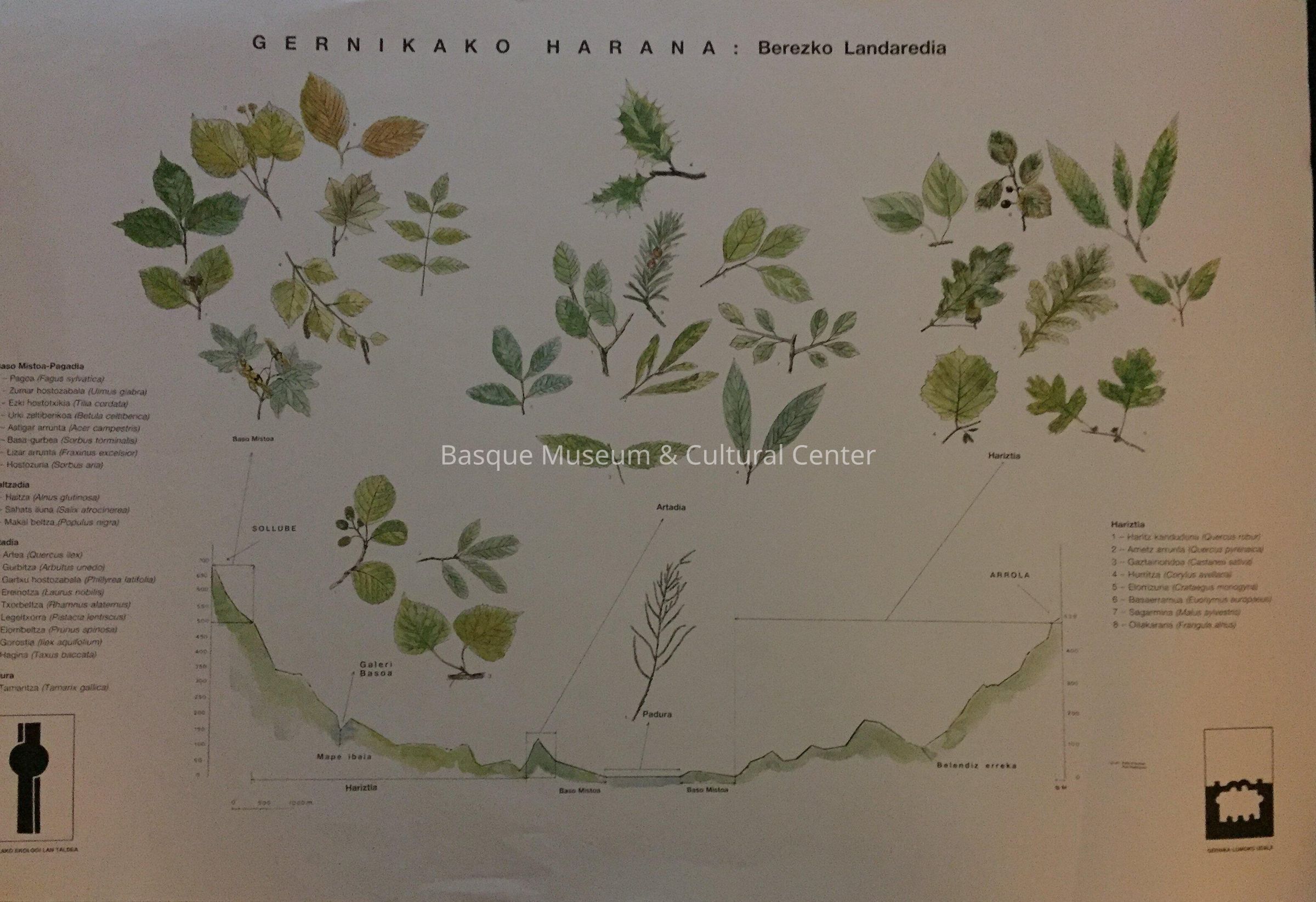 Color poster identifying various types of leaves and their habitat. Published by Gernikako Ekologi Lan Taldea and Gernika-Lumoko Udala. In Euskara.