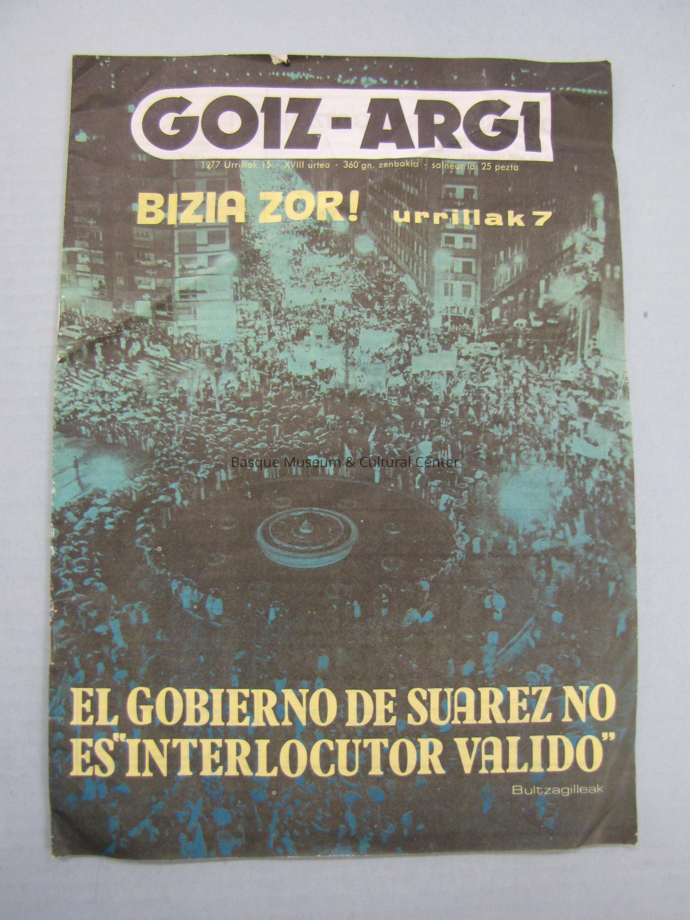 Goiz-Argi magazine; printed in Donosti; printed entirely in Euskera; cover depicts some sort of rally or protest in a plaza flooded with people in greenish-blue tint.